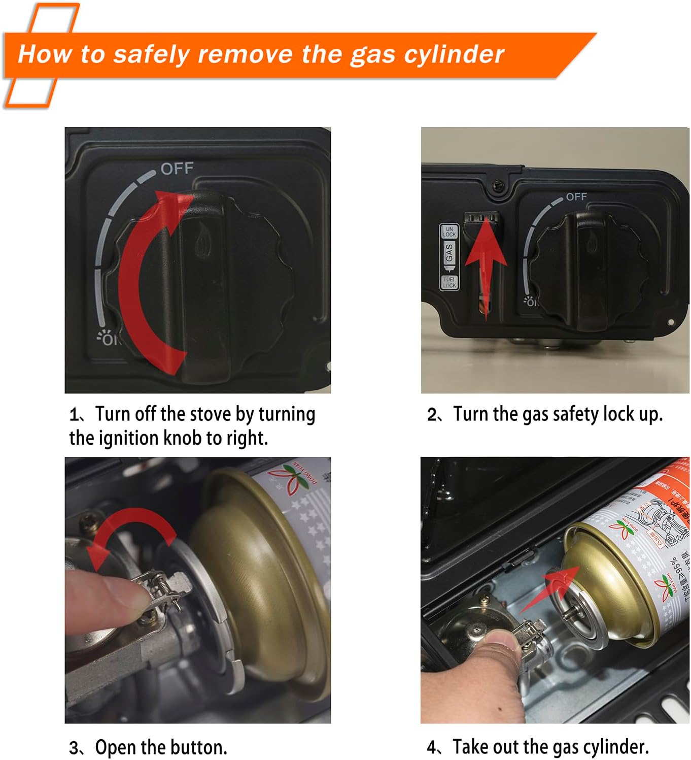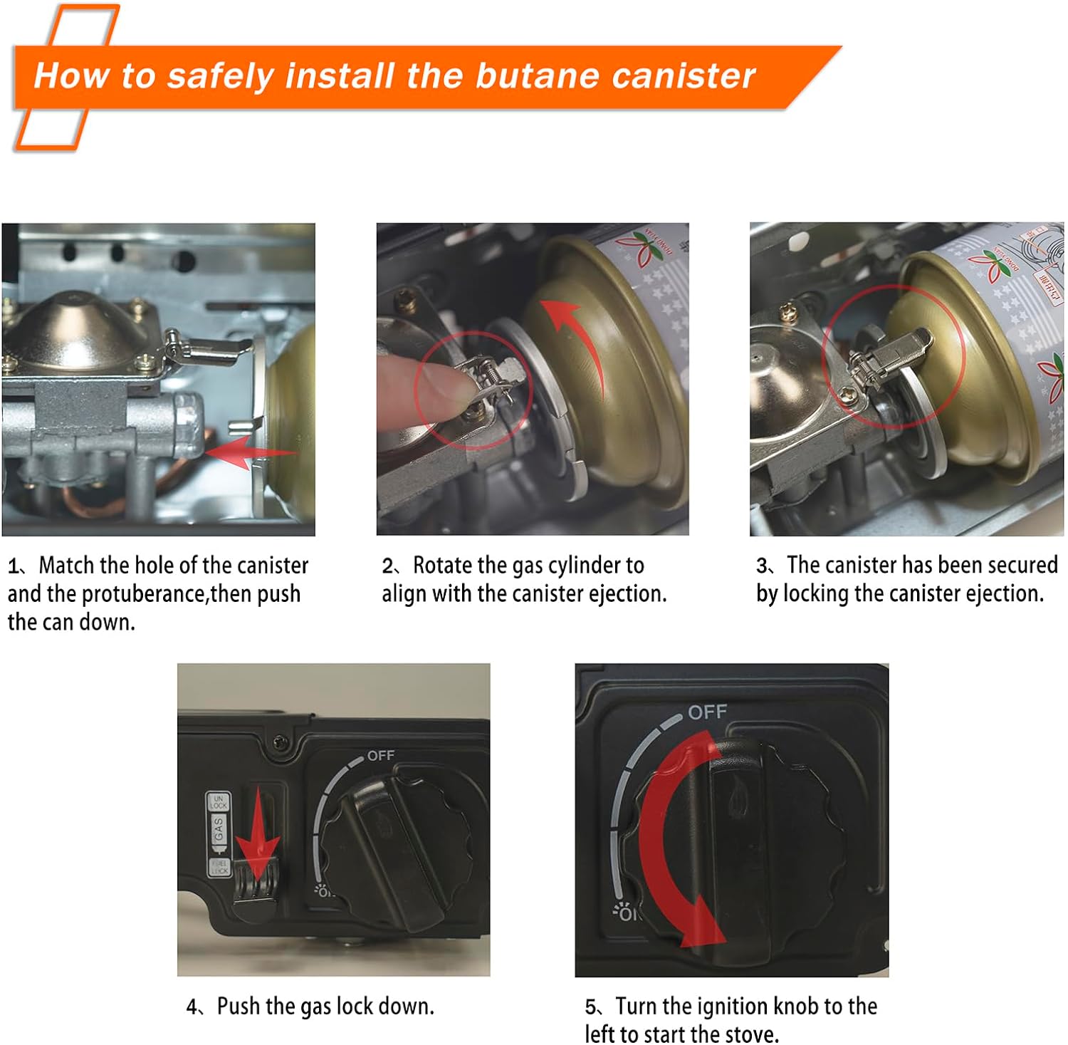 🔥【Safe-to-Use Gas Camping Stove】This butane single burner is equipped with cartridge ejection, a safety lock, and an over pressure shut-off function to guarantee safe operations during cooking or boiling. These safety features are in place to ensure secure use and prevent accidents.