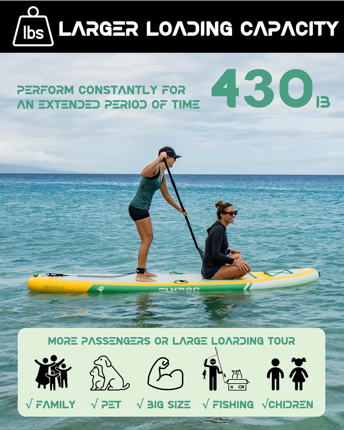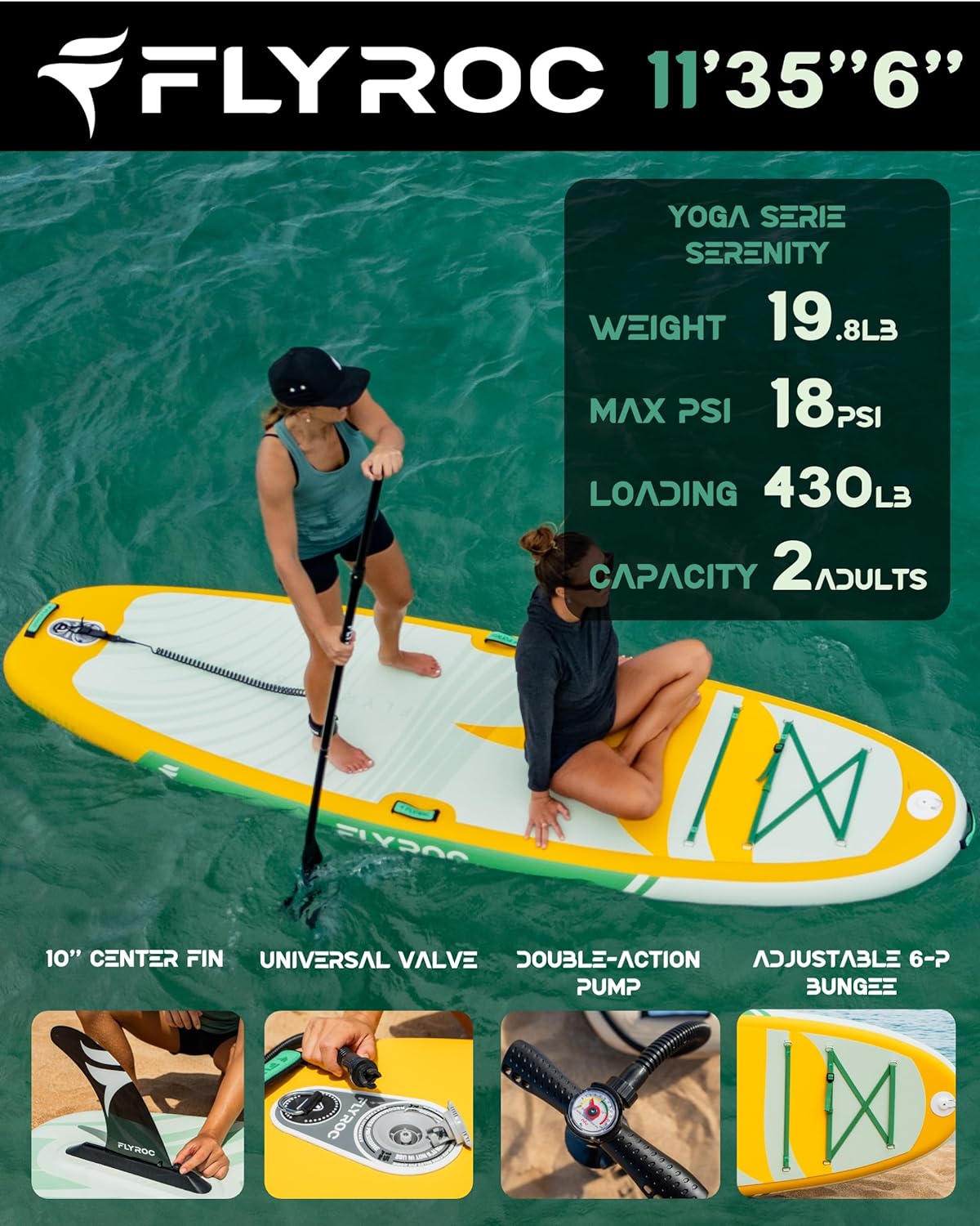 【11‘ & 35” WIDE-BODY, HIGHLY STABLE】 FLYROC All around SUP board is added 3‘’ to its width to increase stability on all water. The round top also adding grabbing on an unsettle water surface. FLYROC paddle boards for adults provides calmness and peace on water, making it versatile for all activities like fishing, yoga, and family fun.