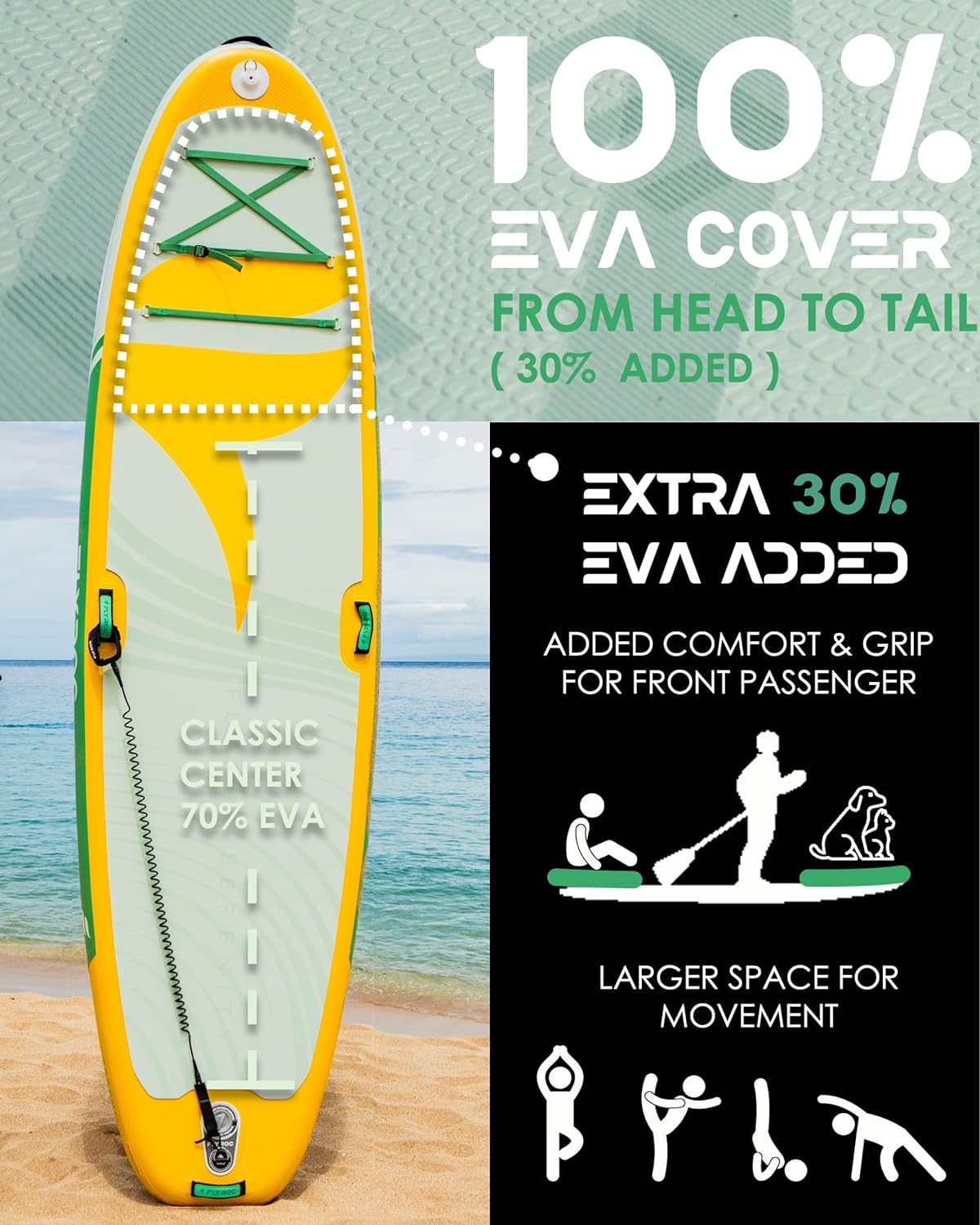【FULL EVA DECK PAD – DESIGNED FOR YOGA】Anti-slip EVA pad is extended maximumly to cover the full deck and provides ultimate grip and comfort under foot in full scale, especially design for yoga which involves larger range of movement. The extra EVA on the front deck greatly improved grip for children or pets sitting there, ideal for multi-passenger’s trip.