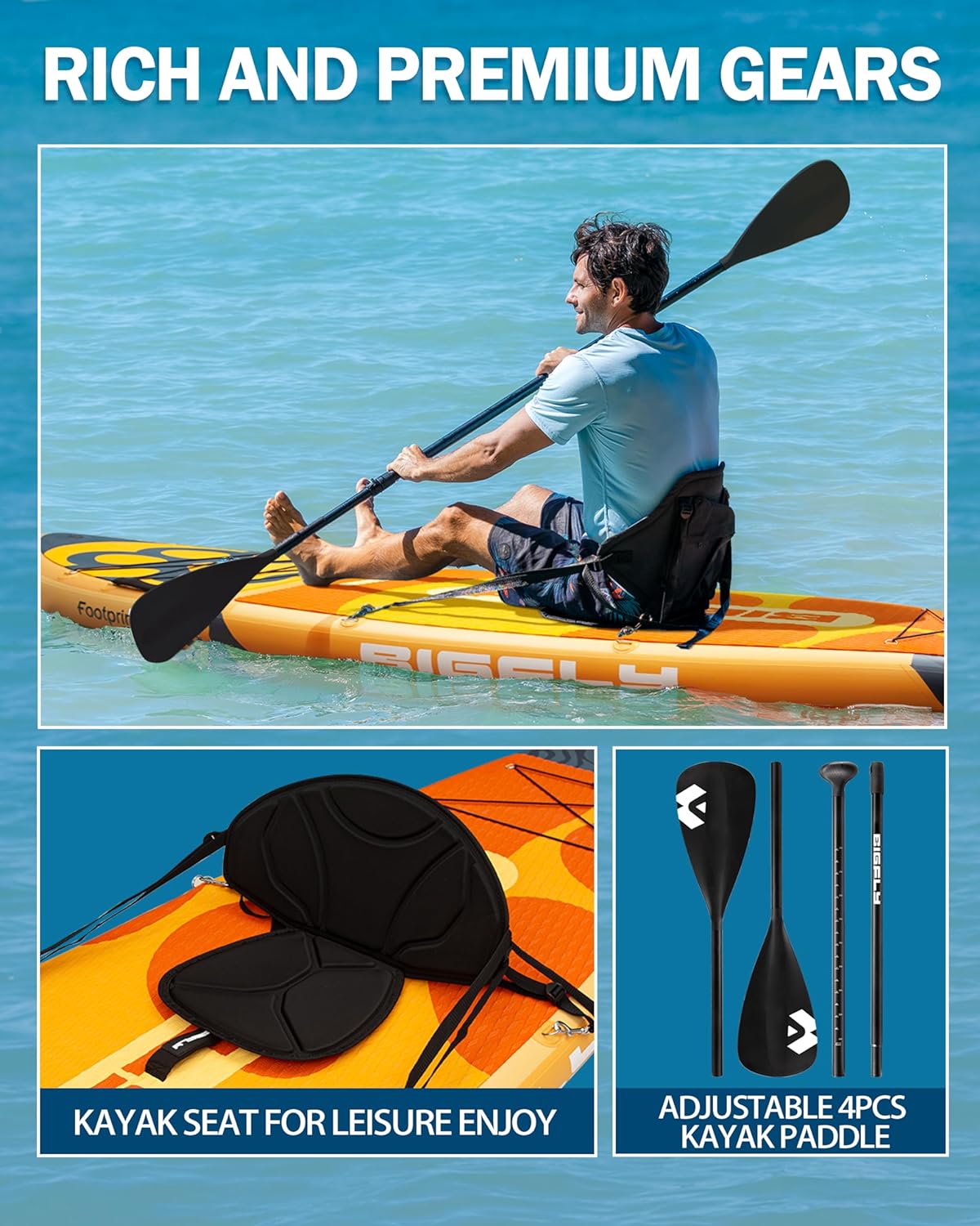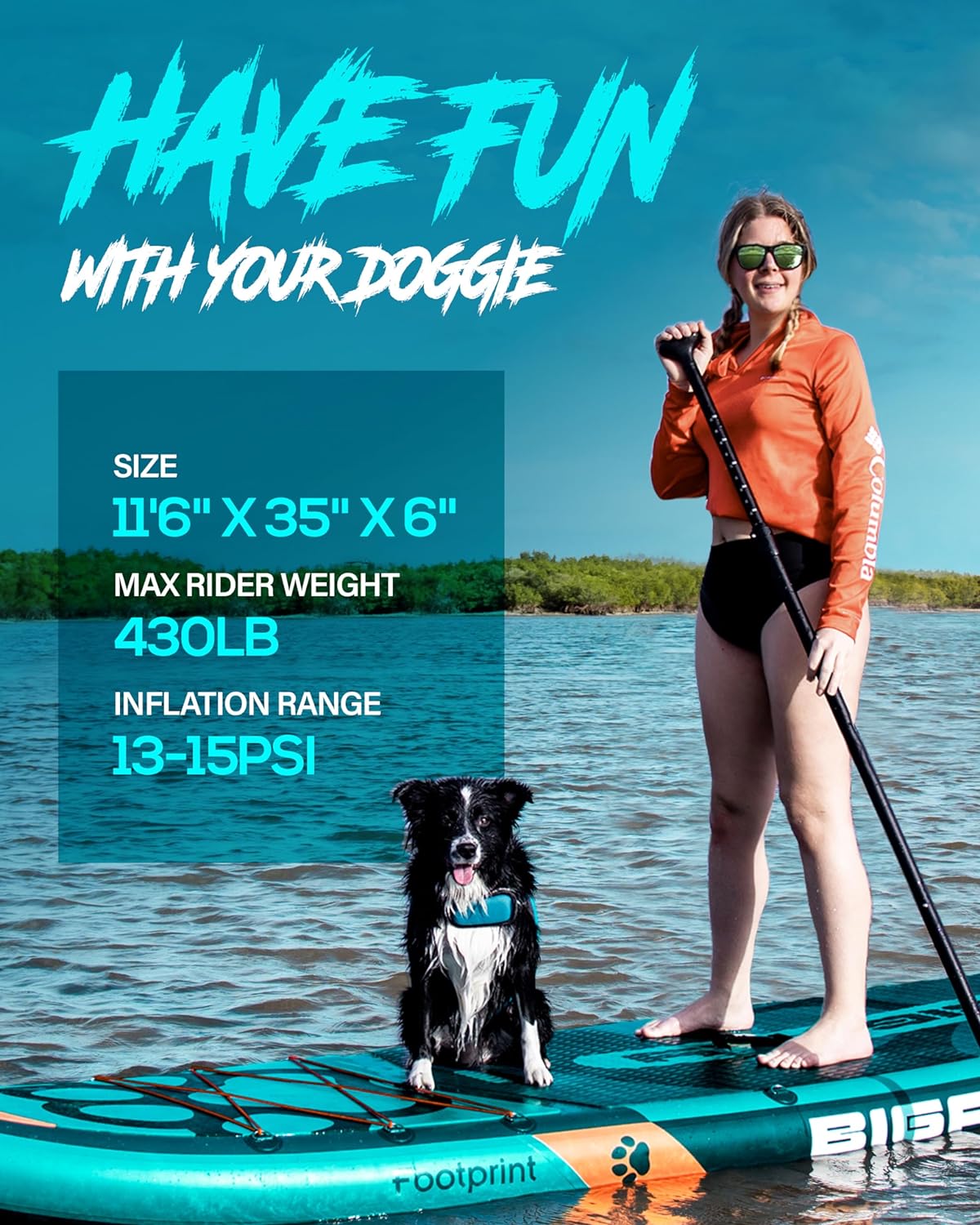 【Widened Board Design】BIGFLY widened SUP board is 11’6″x35″x6″, 35″ wide board provides more stability performance and carries more,especially,with your family member and dog,it is easier for both beginners and veterans to stand up and keep balance.