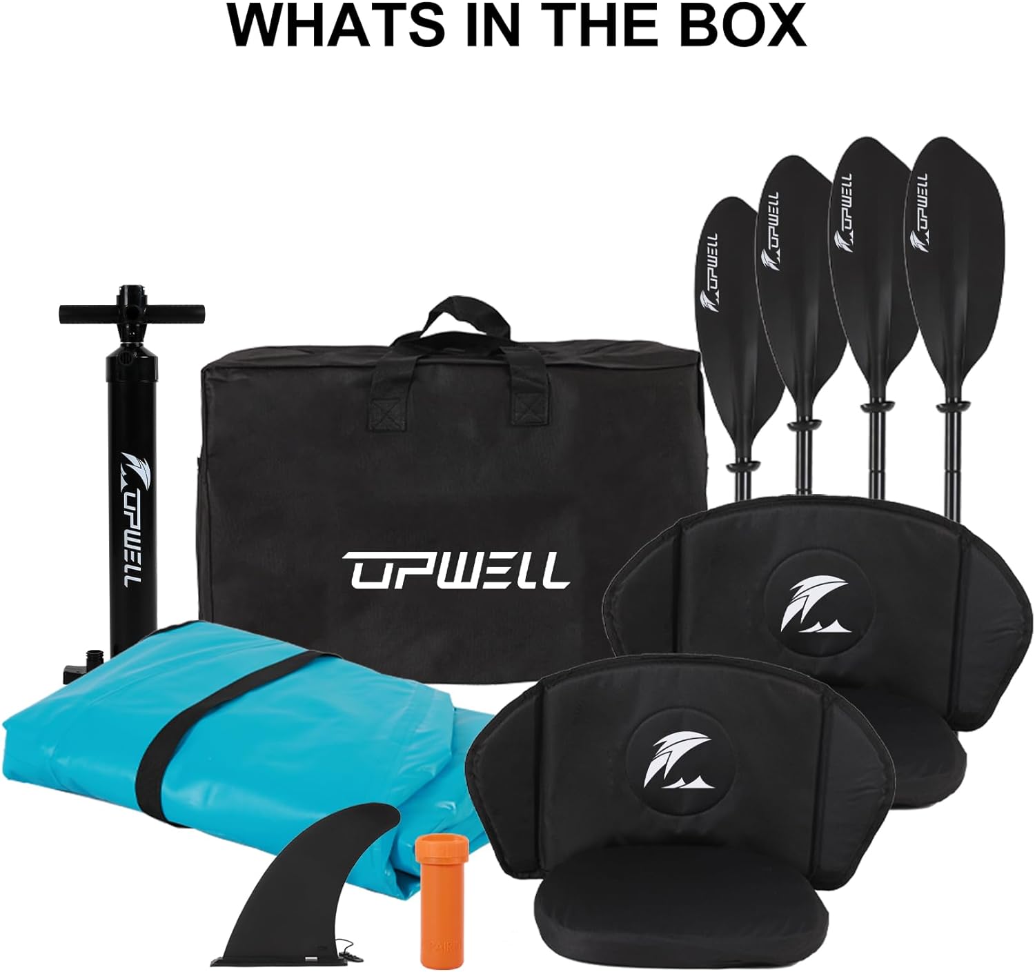 【FULL SET OF ACCESSORIES】Purchase one you will get: 1x inflatable kayak for 2 people, 2x Aluminum alloy paddle, 1x carry bag for storage, 1x removable tracking fin, 1x emergency repair kit, 1x hand pump for quick inflation and deflation, 2x kayak seat offers a thick padded cushion, along with a supportive and breathable high backrest to keep you cool on warm days.