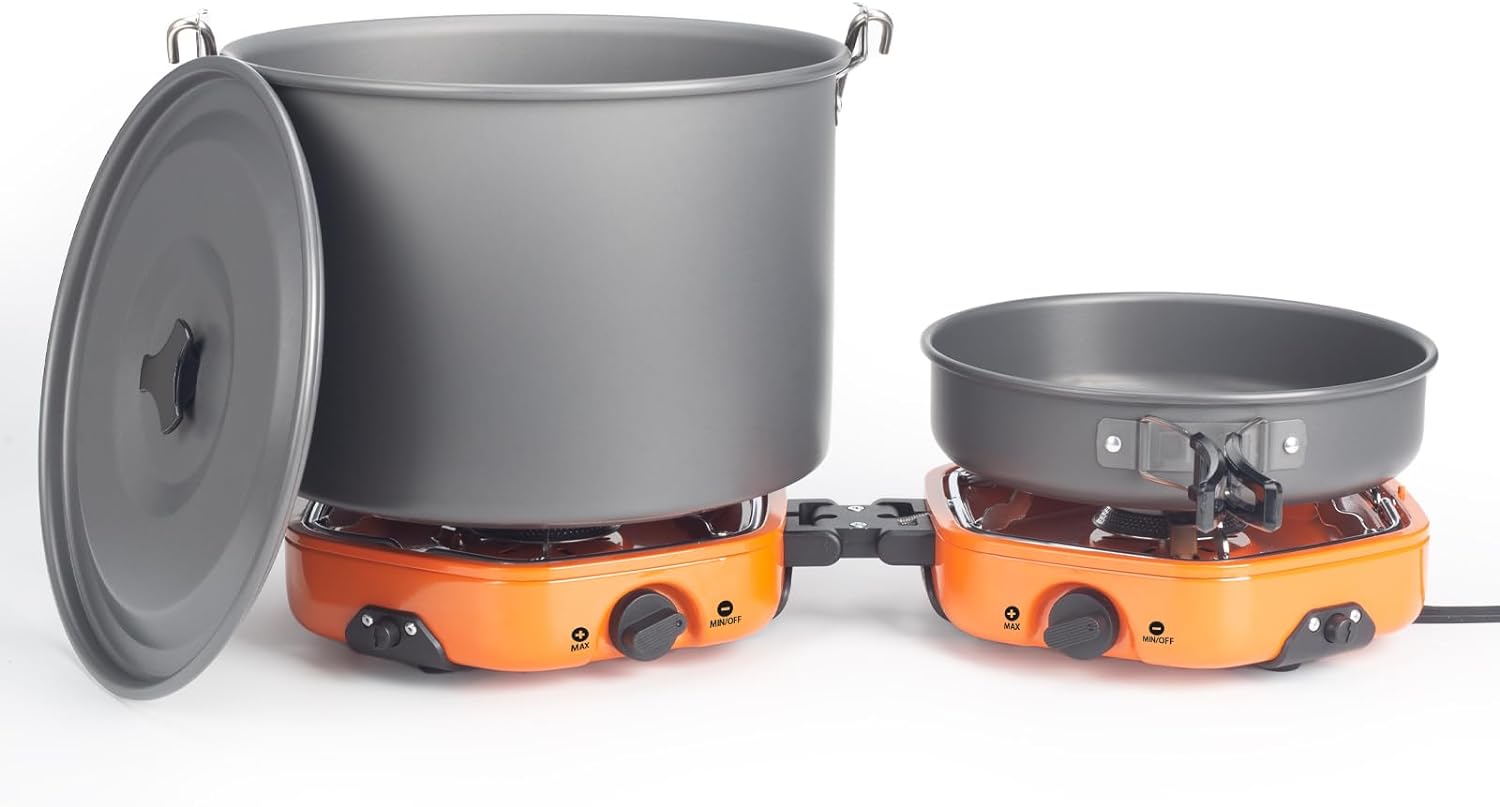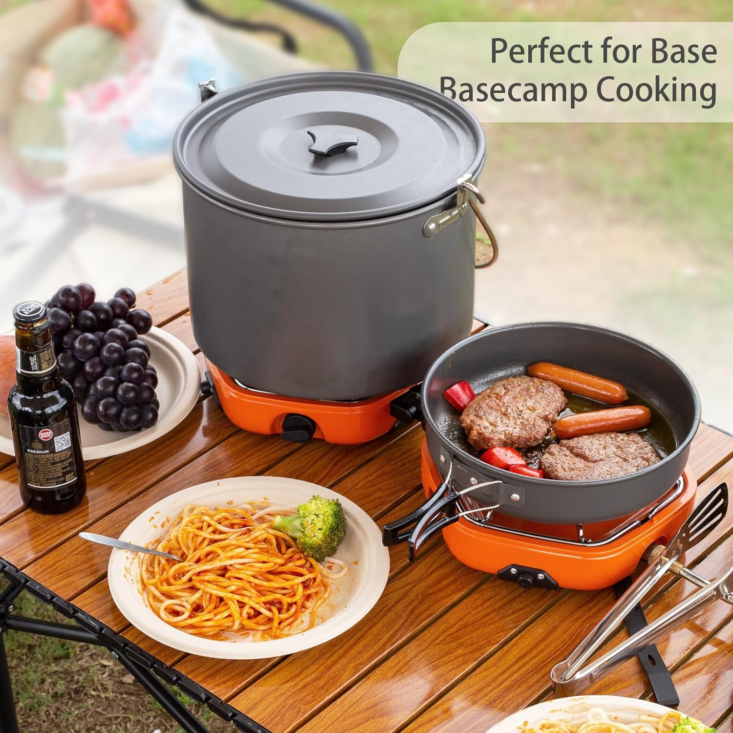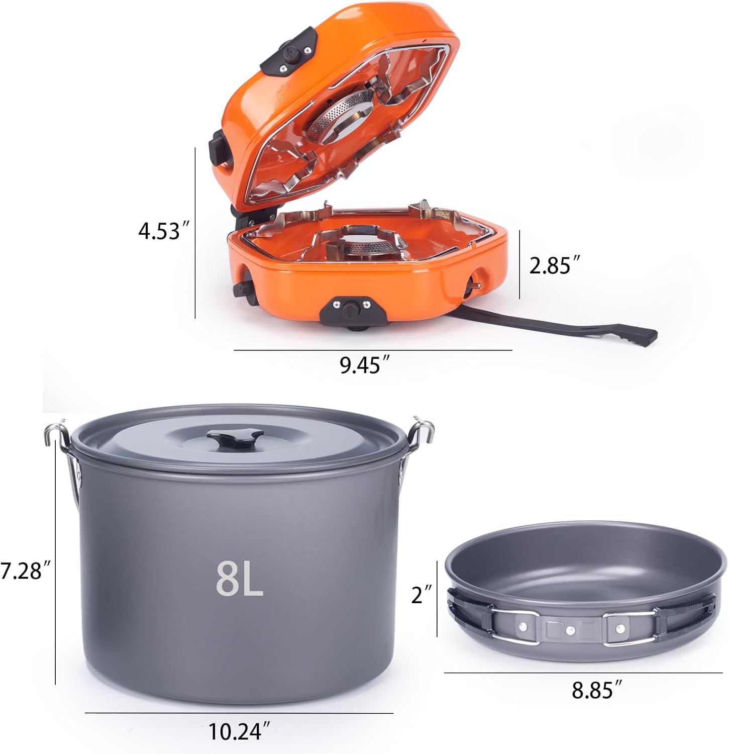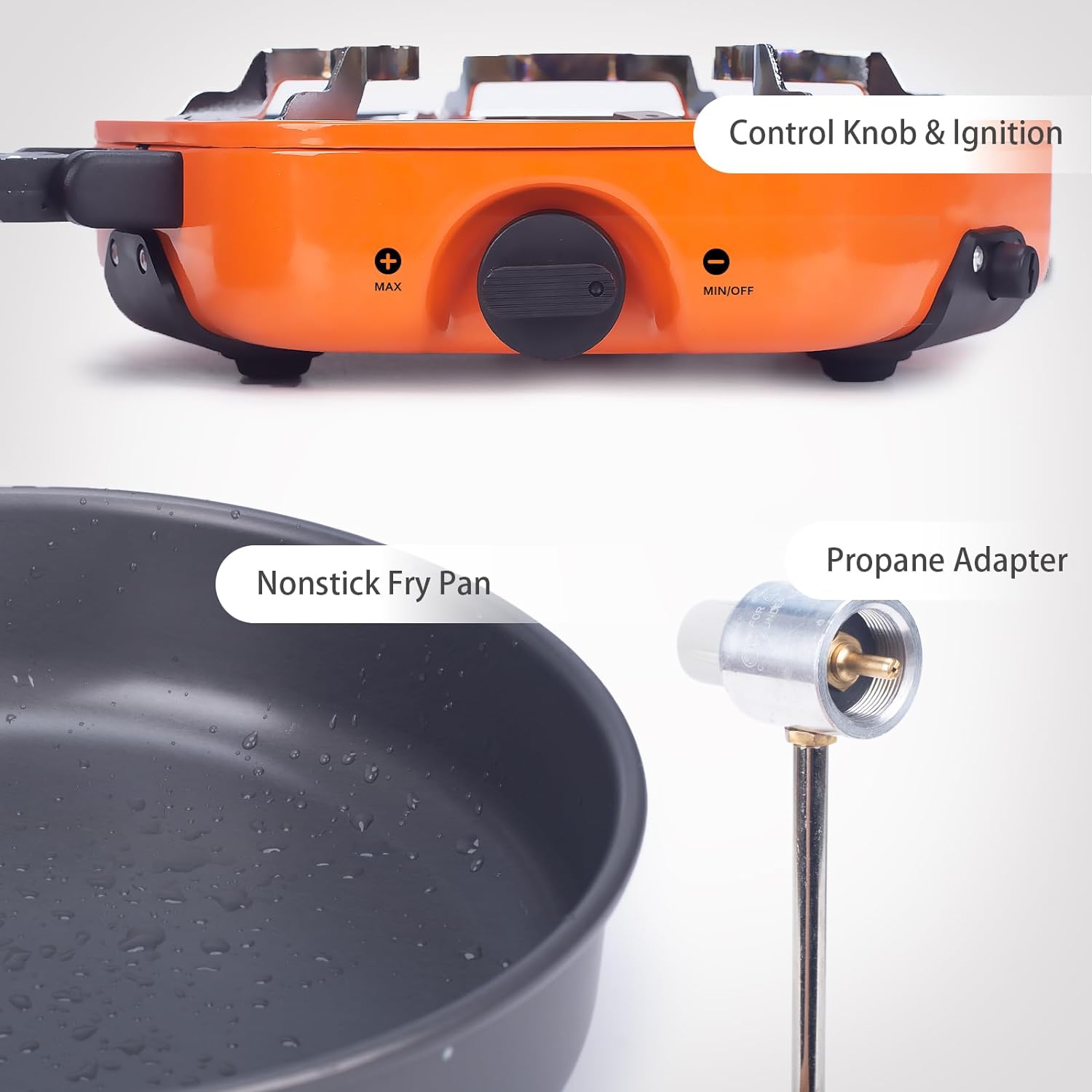 Complete Cooking Kit: Includes a compact folding 2-burner camping stove, 9″ coated nonstick fry pan, 8L camping cooking pot, carry bag, windscreen, and propane adapter (compatible with isobutane or mixed isobutane fuel canisters). All components neatly stow in the included travel bag.