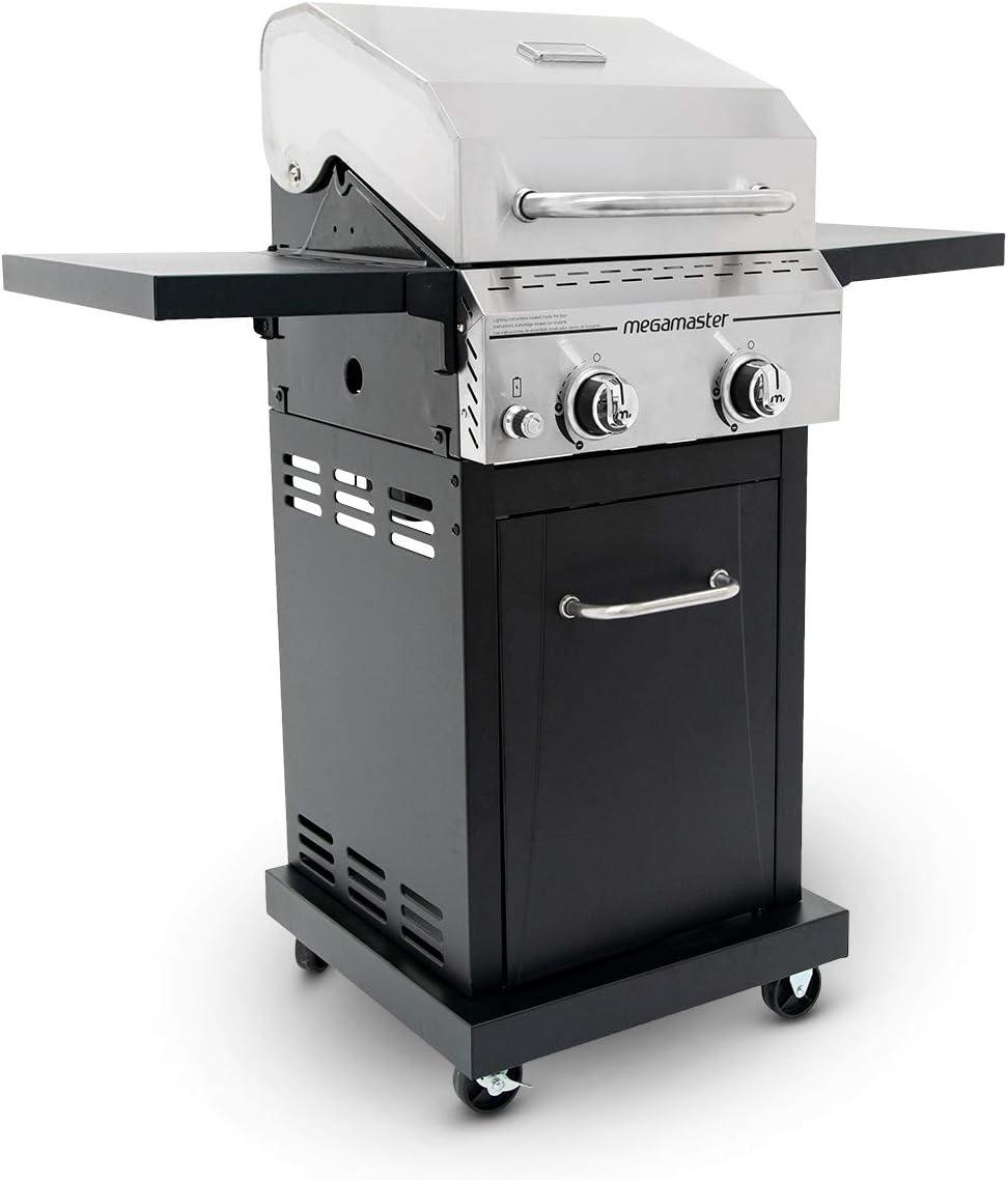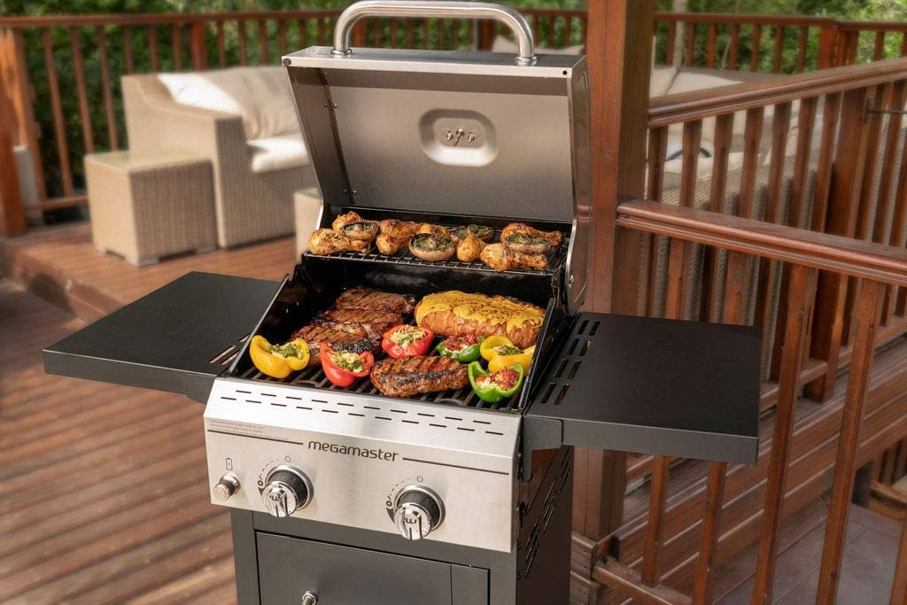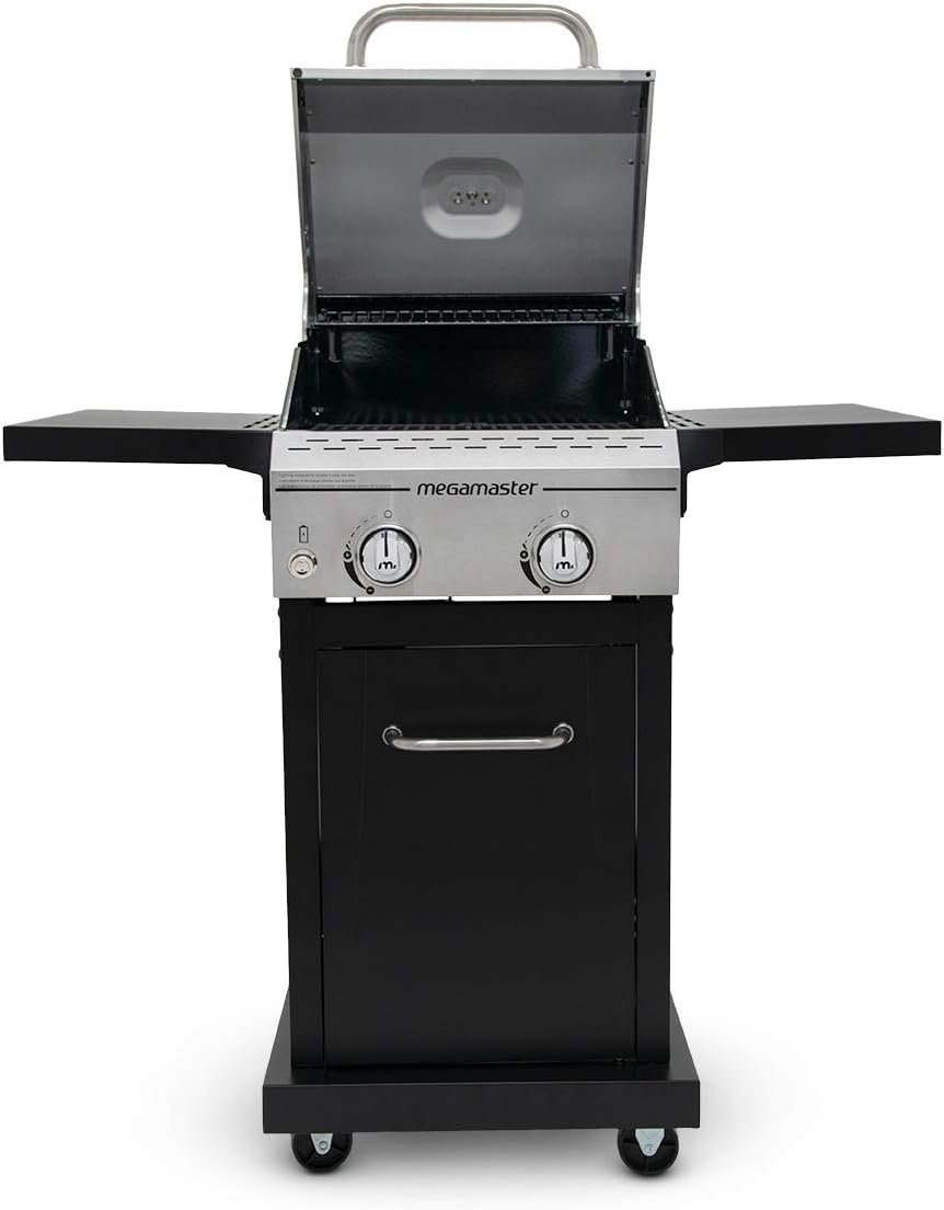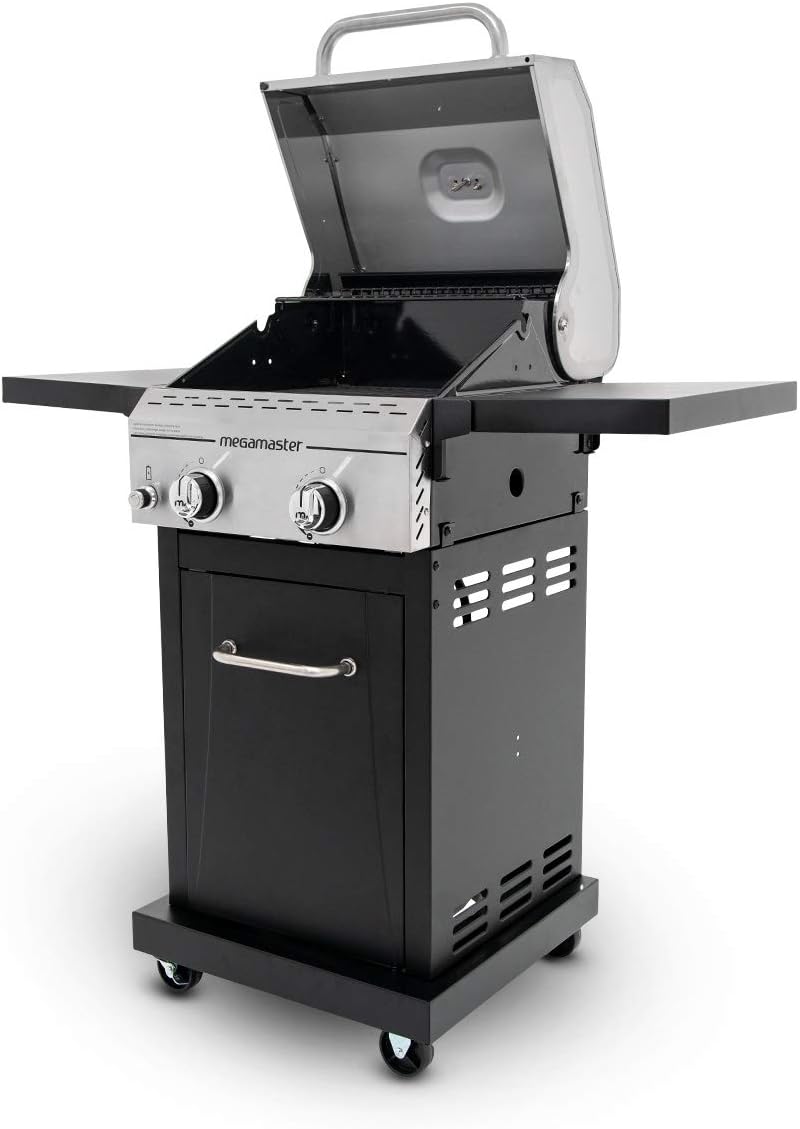 “When the mood to barbecue strikes, don’t let lack of space stop you with the Megamaster 2-burner propane gas grill. Perfect for apartment living or wherever outdoor room is in short supply. with a surprising 418″” Of cooking space you can grill feasts for two or more. equipped with two independent stainless steel main burners that fire up at the press of the battery operated ignition button. the burners can supplyup to 28, 000 BTU of total flame roasting power. inside, you’ll find a durable cast iron cooking grid. Below the grids, two porcelain flame tamers distribute heat, protect the burners from drippings & turning them into flavorful smoke for that unmistakable grilled taste. To save space, we added foldable side shelves that conveniently fold away when not in use. Plus, a cart with wheels neatly stores your propane tank & connection. turn even the smallest outdoor area you’re your personal BBQ spot with the Megamaster 2-burner propane gas grill. “