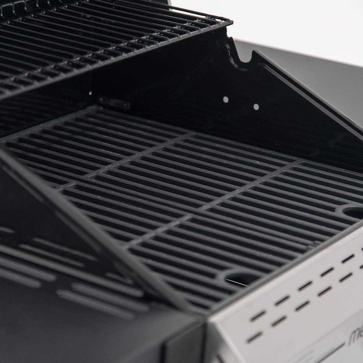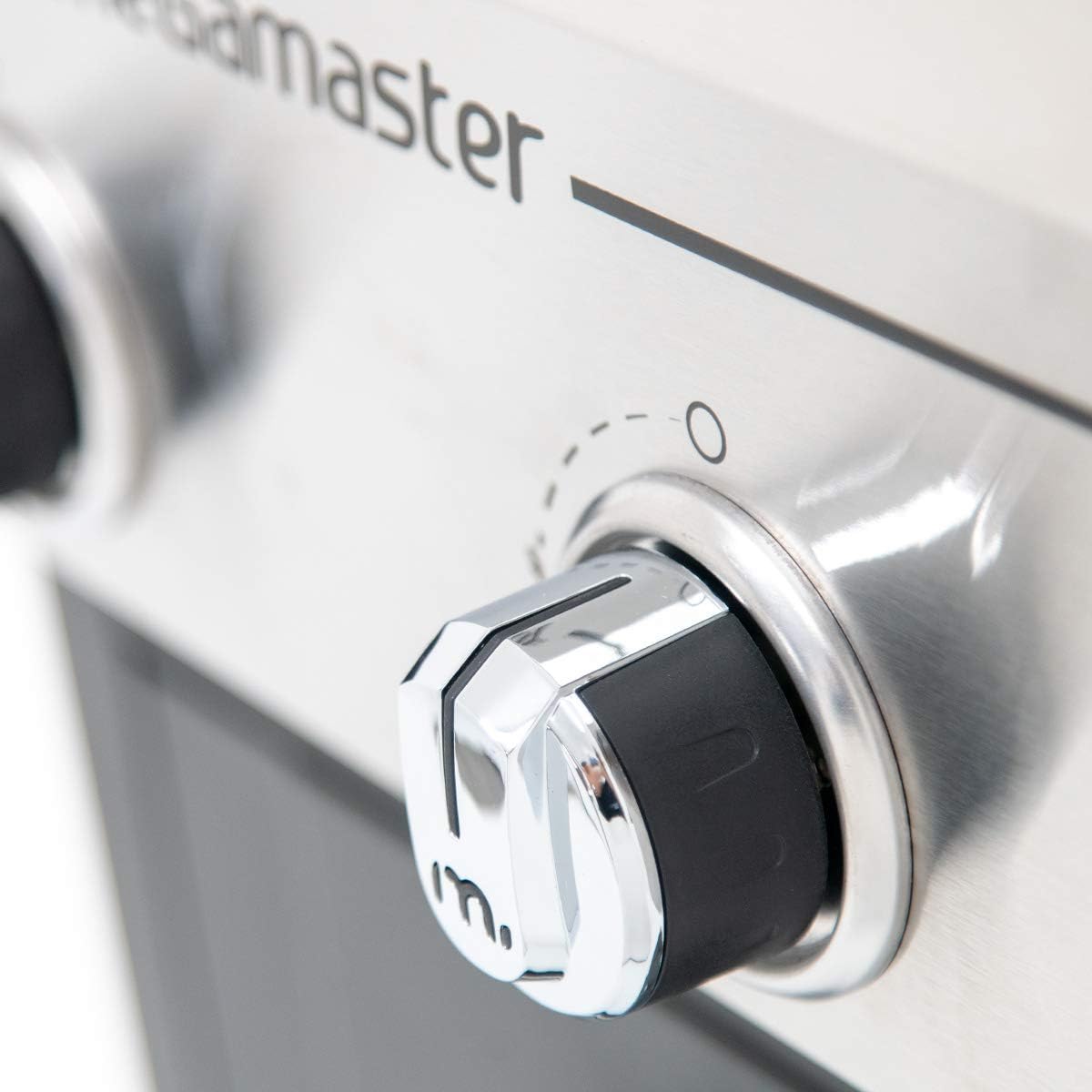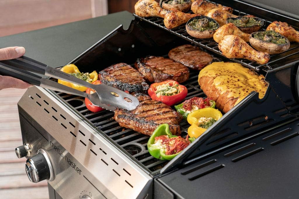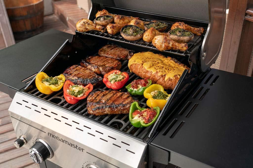 “When the mood to barbecue strikes, don’t let lack of space stop you with the Megamaster 2-burner propane gas grill. Perfect for apartment living or wherever outdoor room is in short supply. with a surprising 418″” Of cooking space you can grill feasts for two or more. equipped with two independent stainless steel main burners that fire up at the press of the battery operated ignition button. the burners can supplyup to 28, 000 BTU of total flame roasting power. inside, you’ll find a durable cast iron cooking grid. Below the grids, two porcelain flame tamers distribute heat, protect the burners from drippings & turning them into flavorful smoke for that unmistakable grilled taste. To save space, we added foldable side shelves that conveniently fold away when not in use. Plus, a cart with wheels neatly stores your propane tank & connection. turn even the smallest outdoor area you’re your personal BBQ spot with the Megamaster 2-burner propane gas grill. “