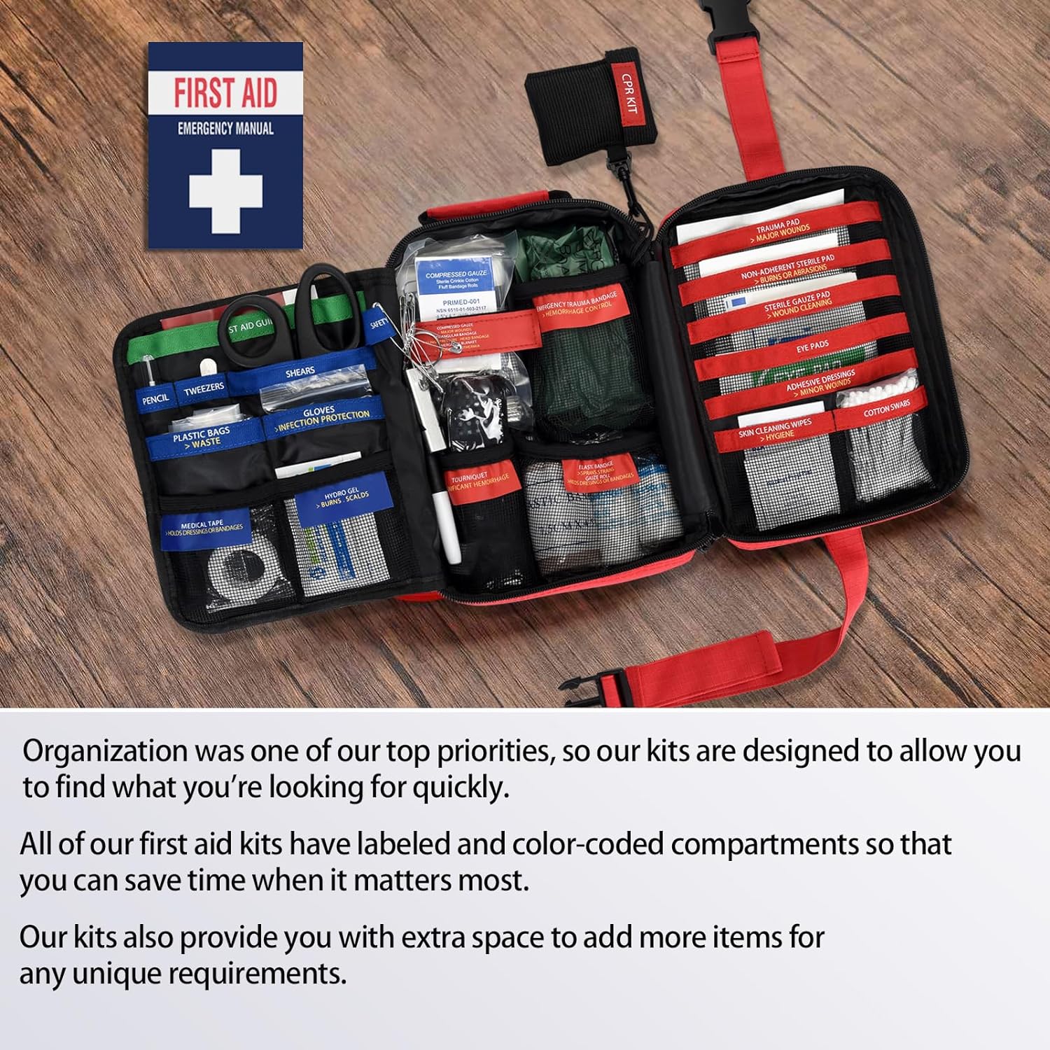 👍🏻【Sturdy, Portable and Additional Space】 The trauma kit surface is made by 600D Polyester, perfect for extreme adventures, robust .The molle-compatible structural straps and snaps make it easily carried on a backpack . Additional space allows you to add customized items based on your personal need.