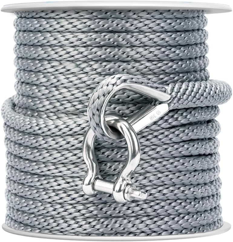【Safe workload】 This 3/8 inch 50ft double braided nylon bow anchor rope has a breaking strength: 1565 lbs. Note: This product has load limitations. It is suitable for small boats. If you have a larger boat, please choose carefully.