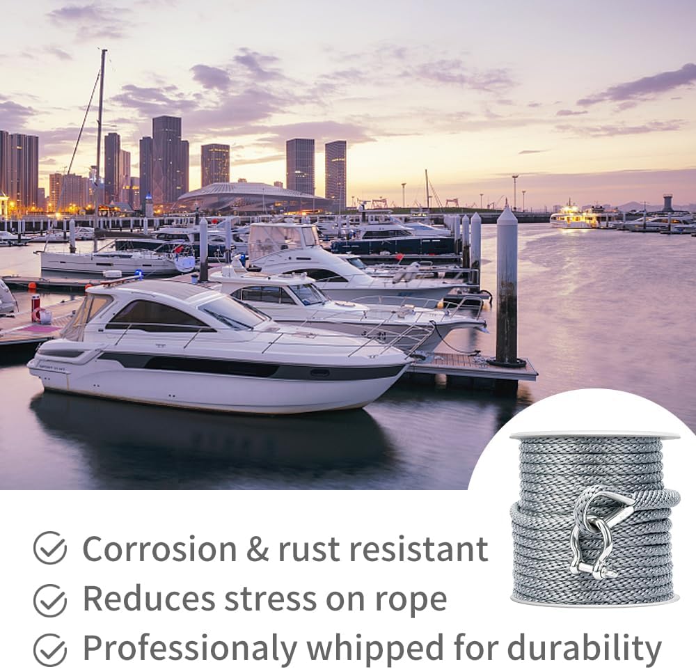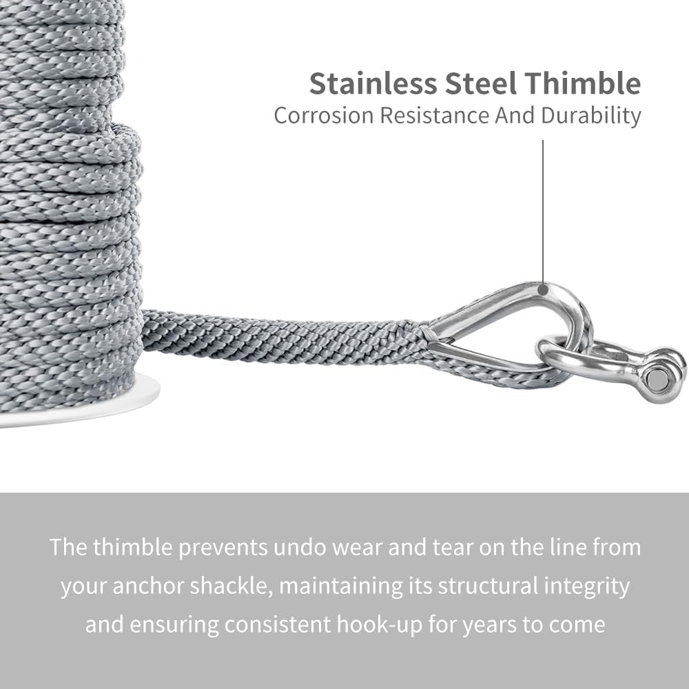 【Stainless steel thimble and shackle】Double braided anchor rope with marine grade stainless steel thimble and shackle, with advanced corrosion resistance and durability, it can be convenient for you to travel in every season. The top release buckle can firmly control your boat and provide reliable safety.