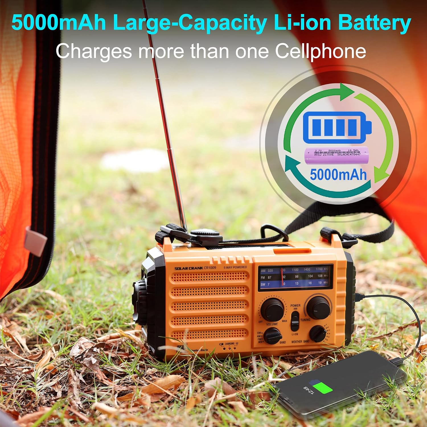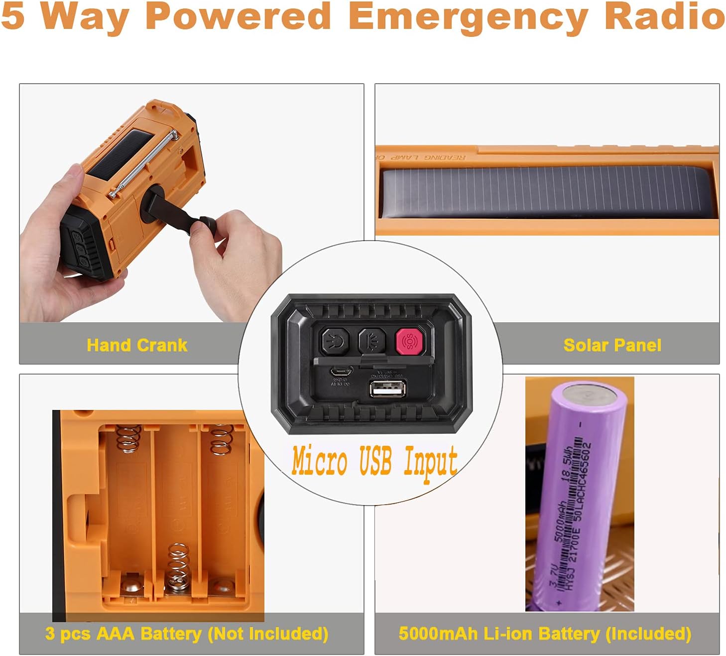 ใ5000 Rechargeable Li-ion Battery & 5 Power SourcesใThis weather radio comes with 5000 large-capacity rechargeable battery ensure your cellphone will be fully charged in emergency. 5 power options, never worry it power off anytime. When the built-in battery is power off, it will be charged by the backup power sources include winding up handle, solar crank, usb input connection or 3 pcs AAA battery.
