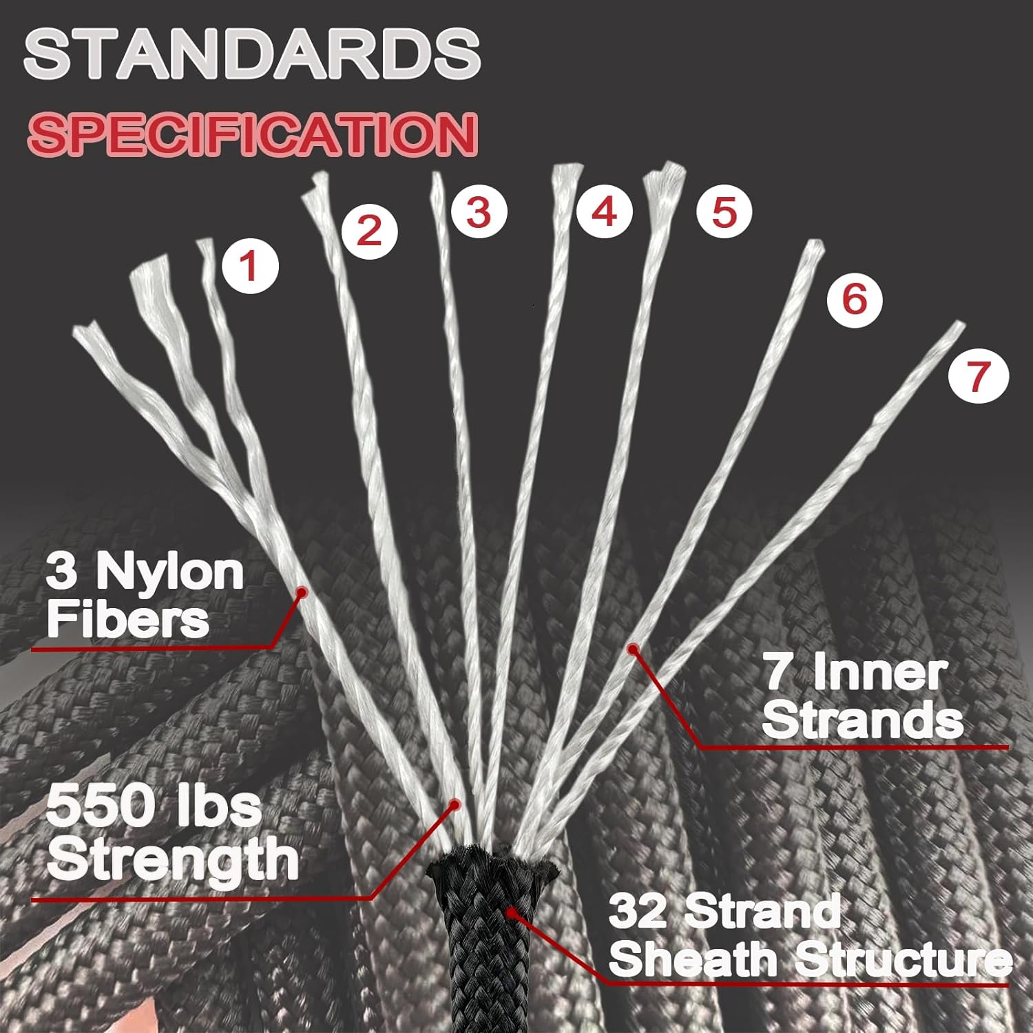 The VVAAGG 550 Paracord has an extremely strong construction with a braided sheath structure consisting of 32 interwoven strands and 7 all-nylon cores, each twisted with 3 nylon fibers. It is smooth, tactile, rugged, and durable.