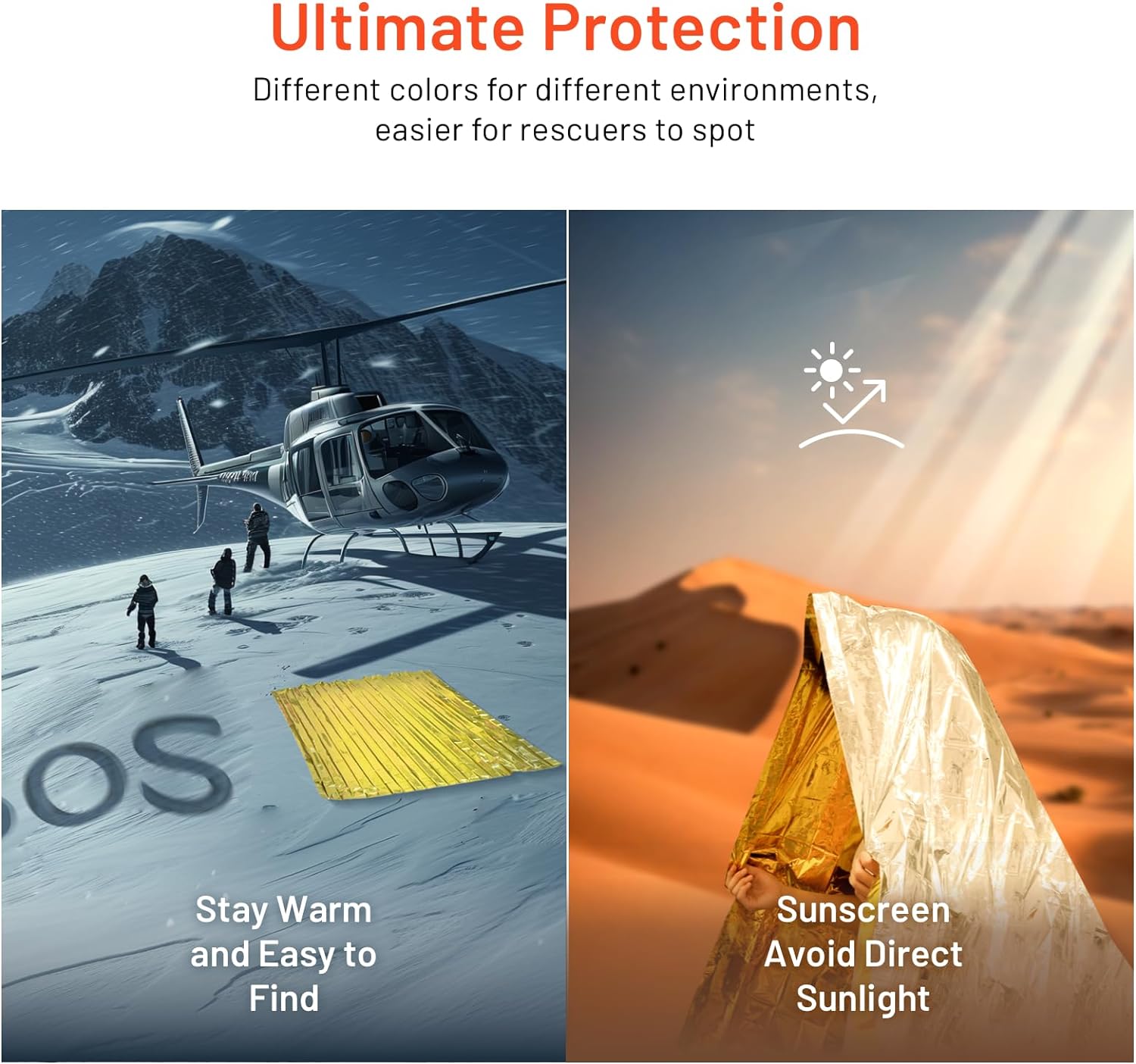 TWO COLOR DESIGN: Griwonmy emergency blankets for survival are gold on one side and silver on the other, the two-color design can be applied to more environments and easier to be found by rescuers.