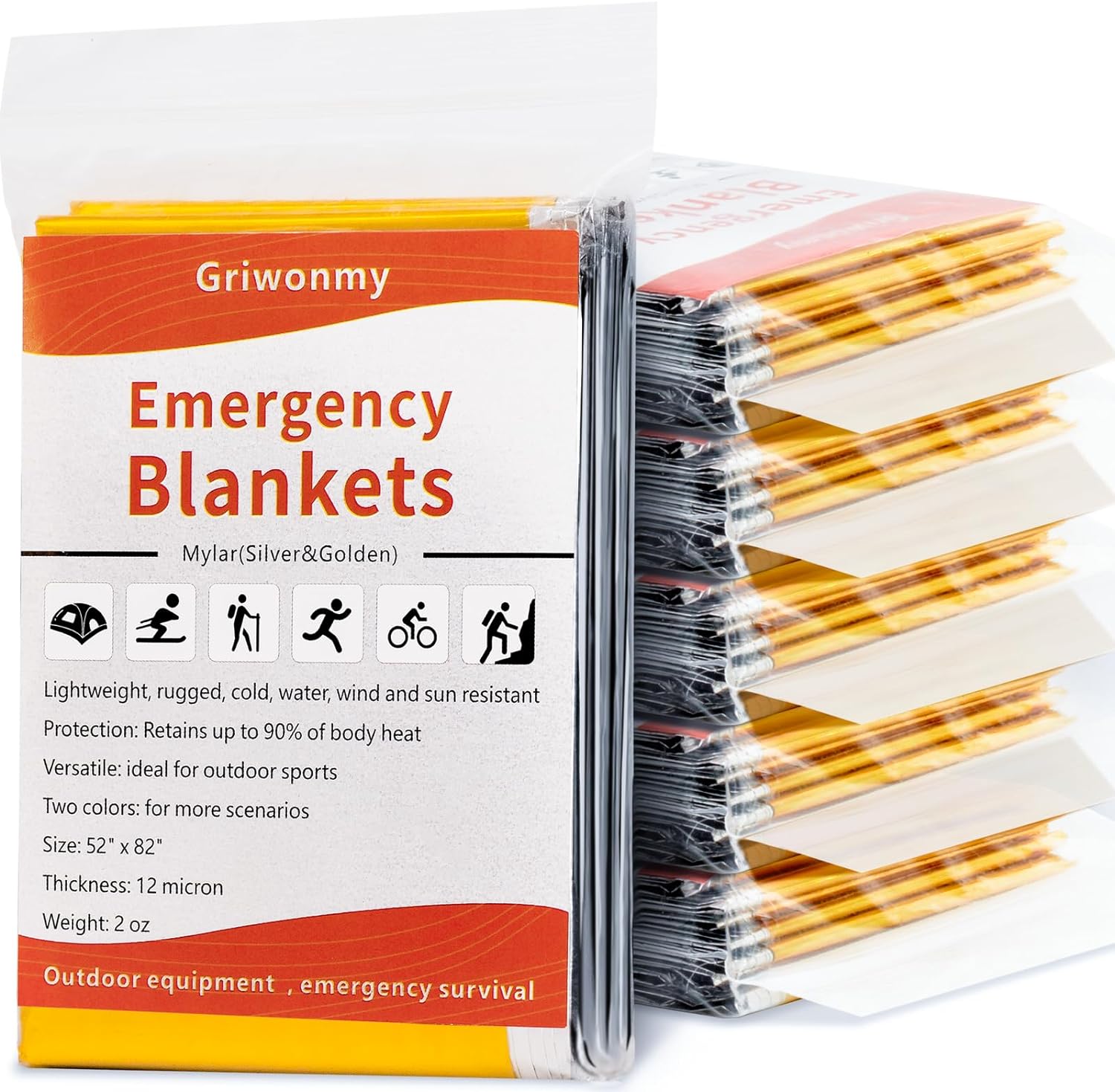 MULTIPLE FUNCTIONS: Griwonmy survival blankets are waterproof and can be used to protect from rain, wind, moisture and sun. Perfect for extreme weather blankets, rescue blankets, emergency response equipment or winter storm supplies. It can be used as ponchos, emergency tents, emergency shelters, lightweight tarps, moisture resistant sheets, ropes, trail markers, backpack covers, and other creative uses.
