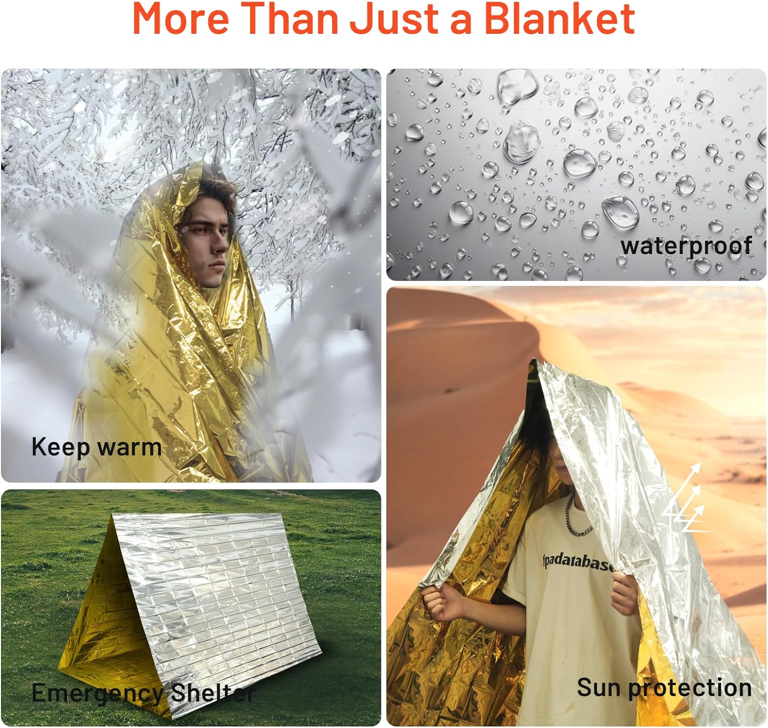 Emergency blanket can protect against wind, rain, snow and moisture, keep your body dry and warm in cold emergency situations, can be covered on the ground to protect against moisture, or covered or wrapped around items to waterproof them, and can be reused.