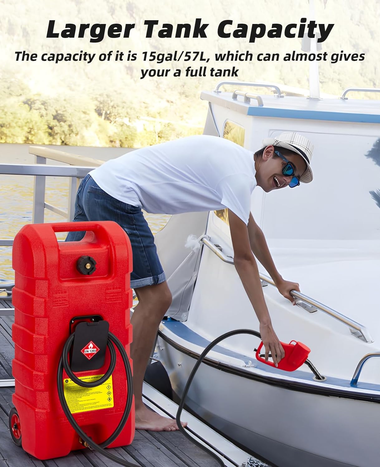 Larger Tank Capacity: The capacity of it is 15gal/57L, which can almost gives your a full tank. The large capacity allows you to store generator gasoline with confidence during hurricane season, or go off-road with it on nice days