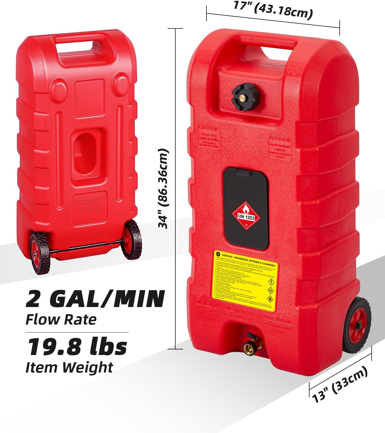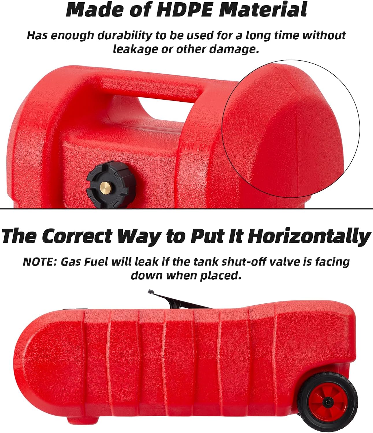 15-Gallon Wheeled Tank:It has 17.5cm (6.88inch) solid rubber wheels that are durable and do not require the wheels to be inflated, lets you maneuver the gas can over rough terrain