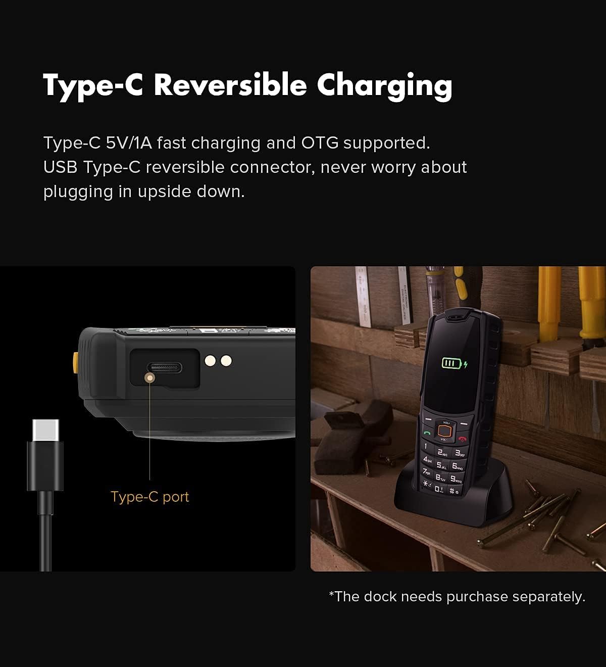[2500mAh Removable Battery] The battery is removable, up to 15 hours talk-time and 13 days (312H) standby time. It charges via either reversible USB-C cable or an optional charging dock (not included). Note: Remember to remove the sticker on the bottom of battery before you turn on the phone.