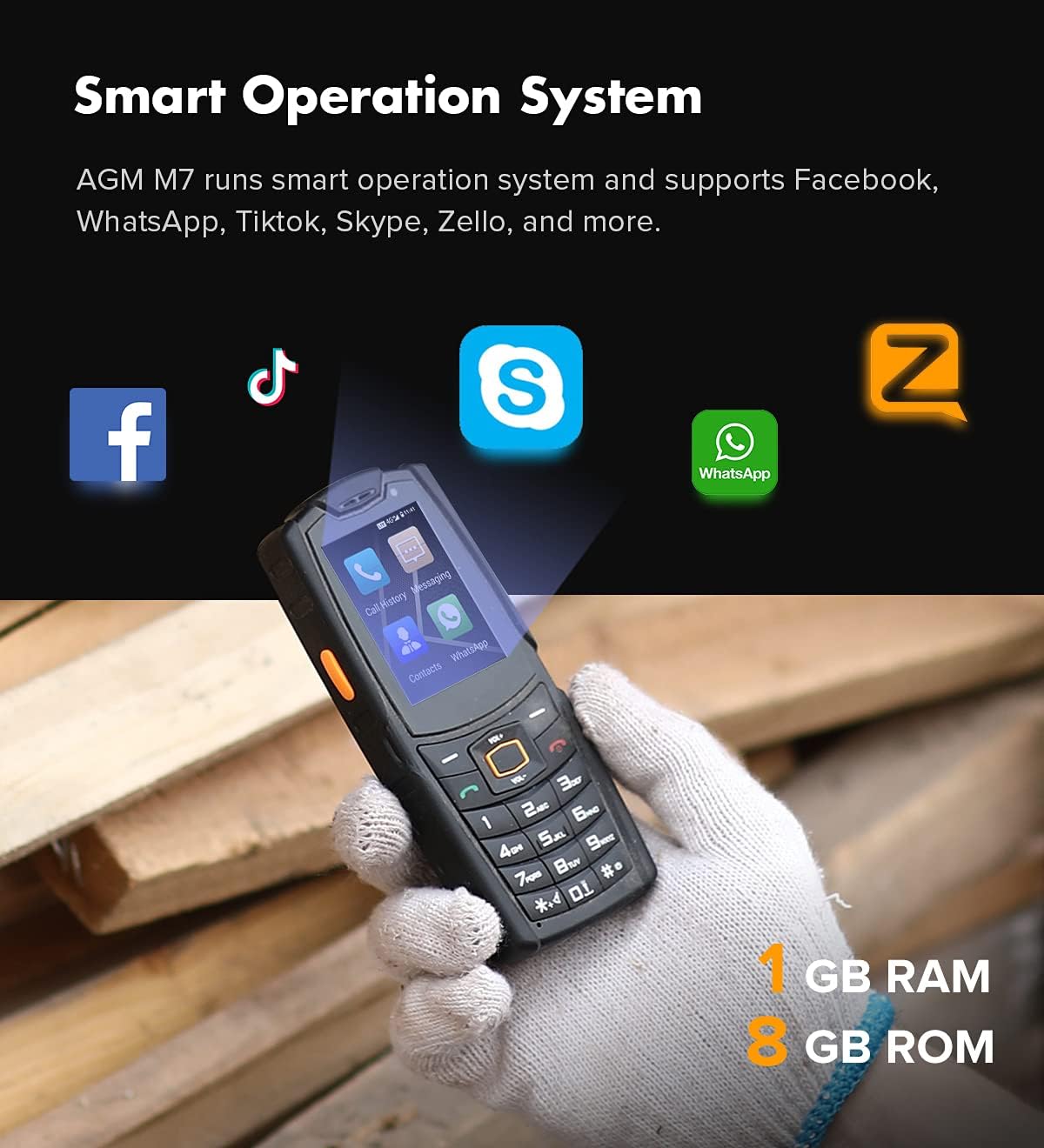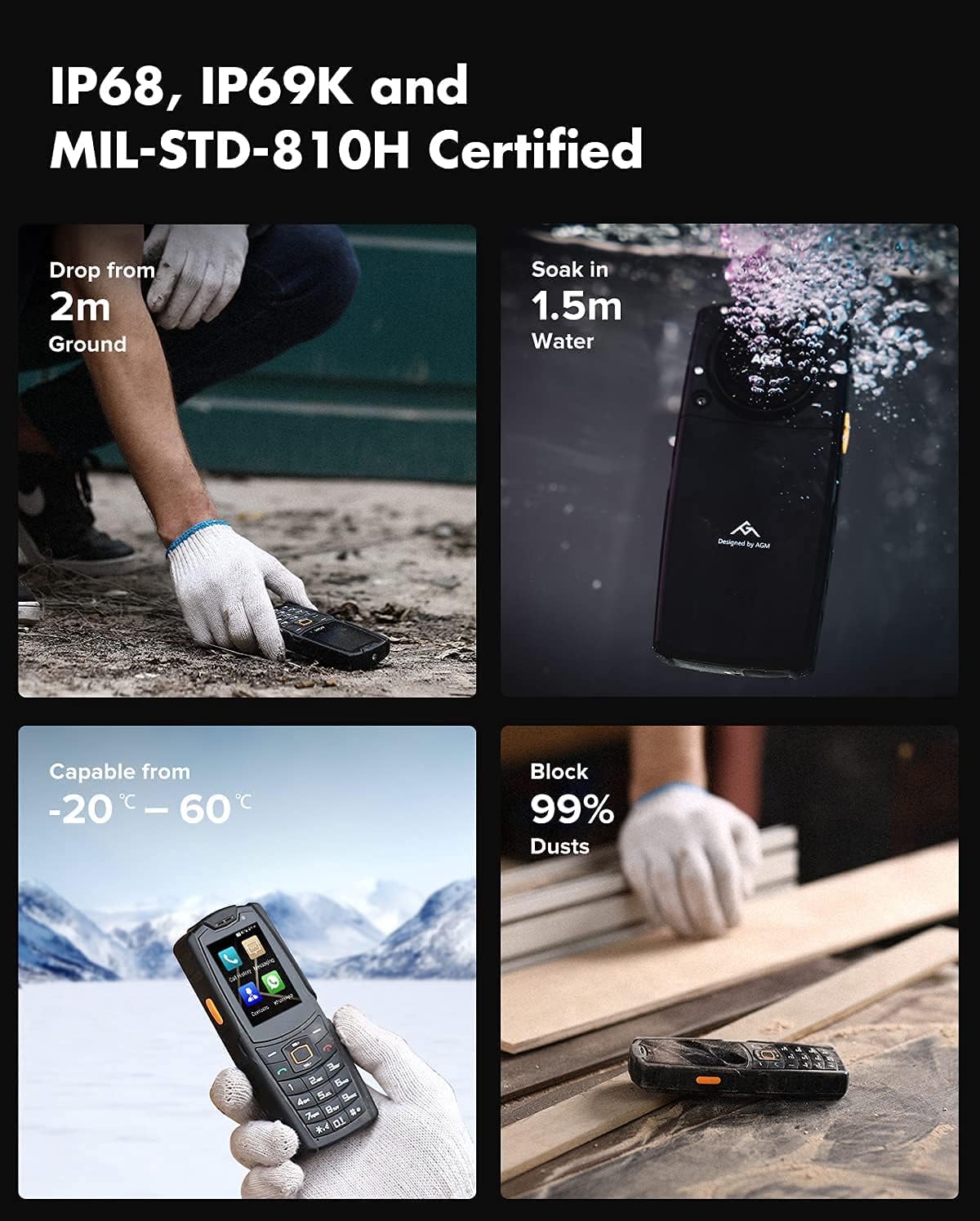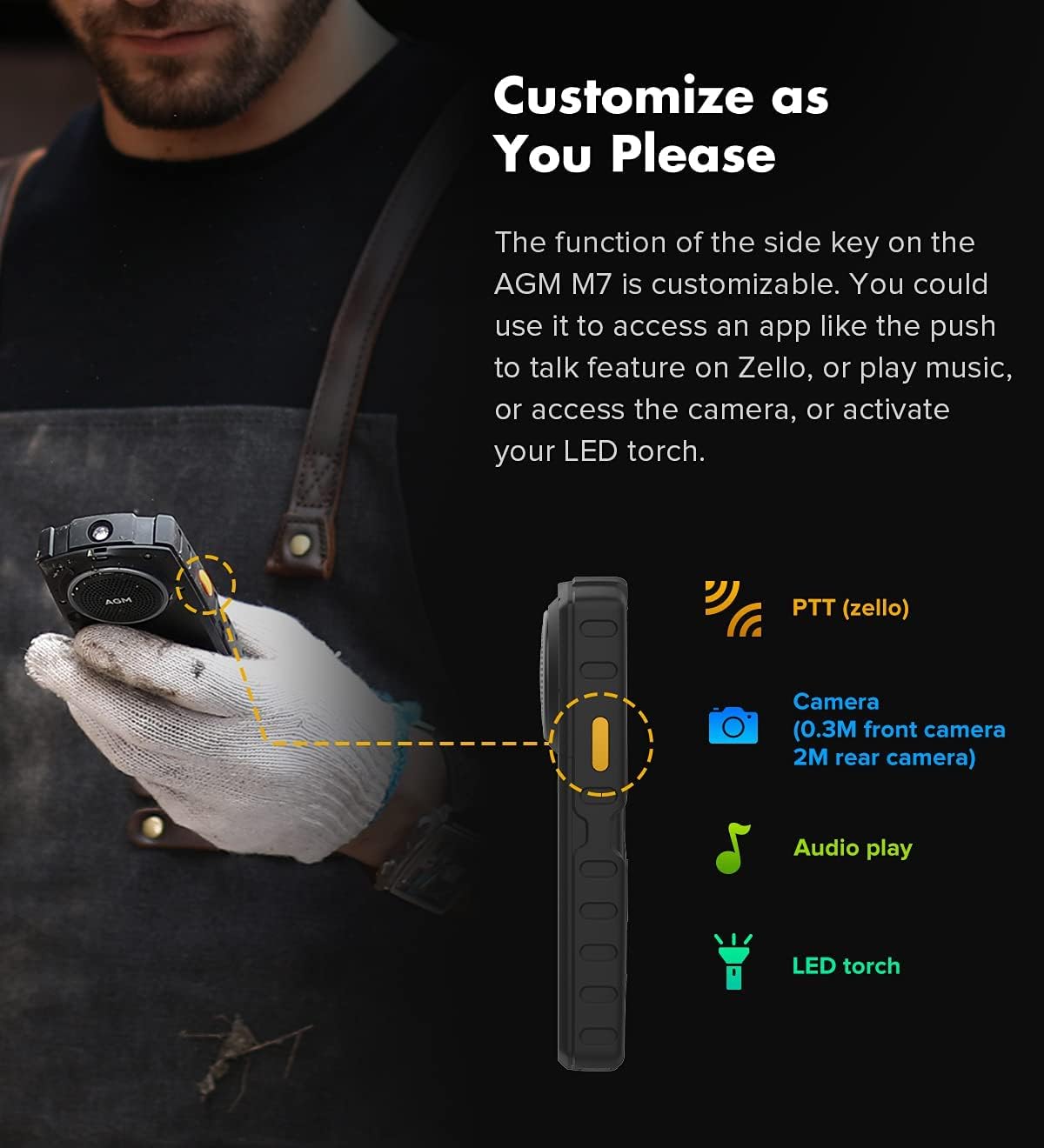 [Military Standards with IP68/IP69k/MIL-STD-810H Certified] AGM M7 rugged phone is rugged, drop proof, dust proof, and water proof. It withstands drop from up to 2m on concrete and survives under 1.5m of water for 30 minutes.