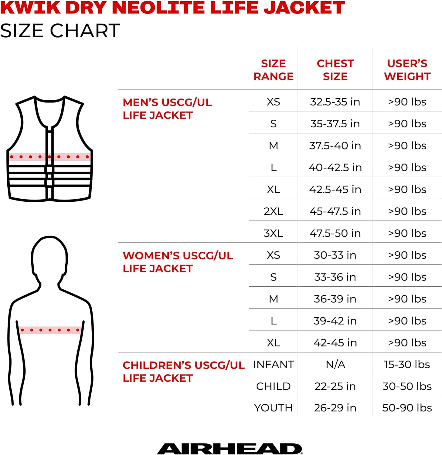 COMFORT – Less bulky design for use when quick response is likely, offers a larger range of motion making it a favorite for water sports. Closed sides, multiple external straps with quick release buckles keep the life jacket securely in place. This life jacket follows the sizing determined by the USGC, please reference the size chart image