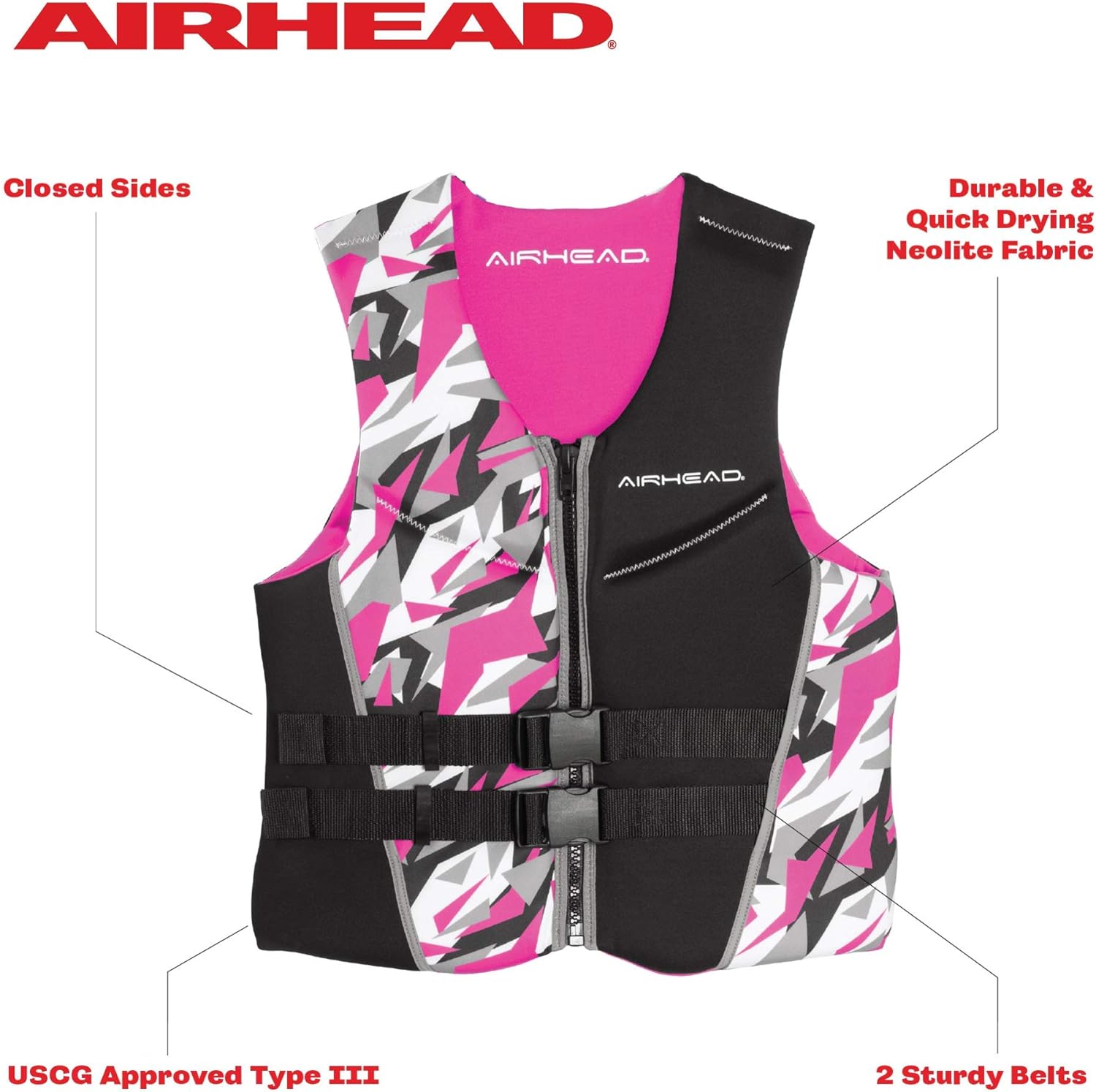 The Airhead Camo Cool Pink life vest is made of lightweight, quick-drying materials and features oversized arm holes for freedom of movement. USCG approved Type III