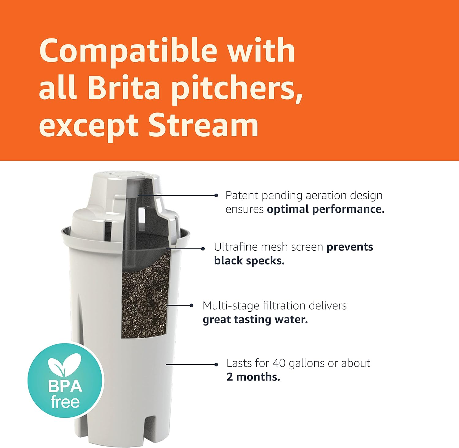 COMPATIBILITY: Replacement water filters for Amazon Basics and all Brita pitchers and dispensers except Brita Stream.