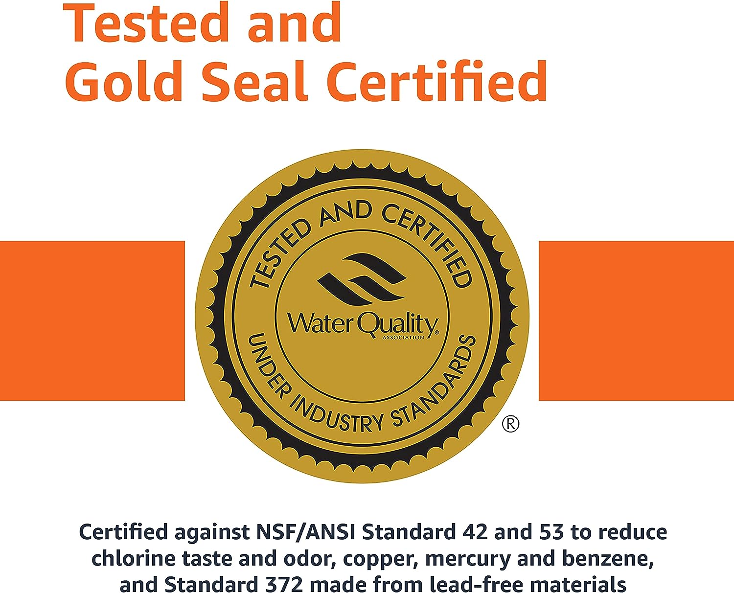 WQA CERTIFIED: Gold seal certified by the Water Quality Association against NSF/ANSI 42, 53 and 372. Certified to reduce chlorine taste and odor, copper, mercury and benzene. Made from lead free materials. BPA free.