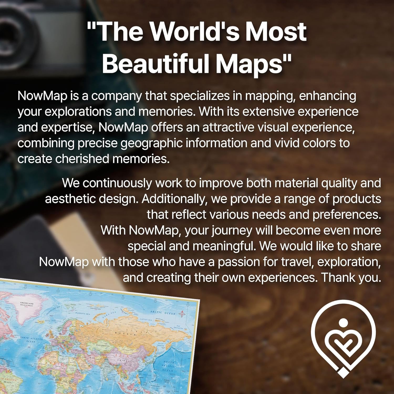 Personalized Travel Diary with Pin Stickers – Document your journeys and aspirations with the included pin stickers. NOWMAP’s map becomes your personalized travel diary, adorned with pins that mark your destinations and dreams, creating a unique and meaningful reflection of your adventures.