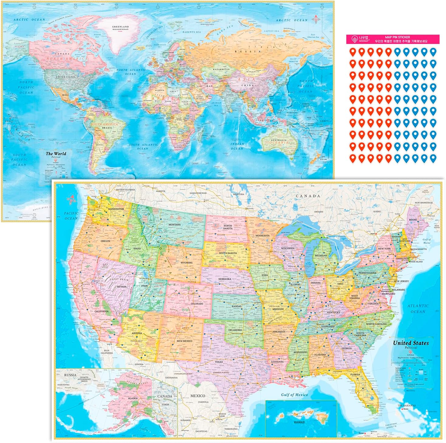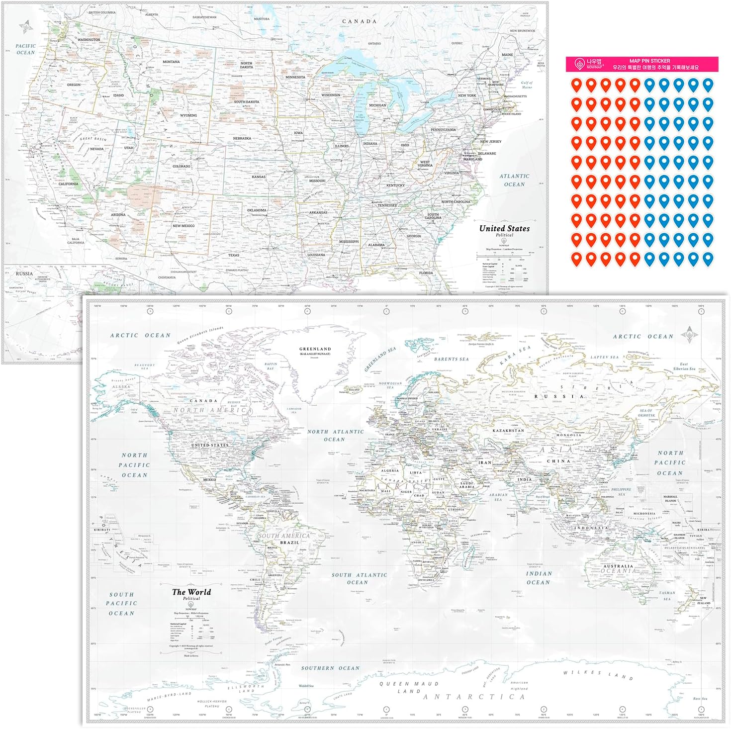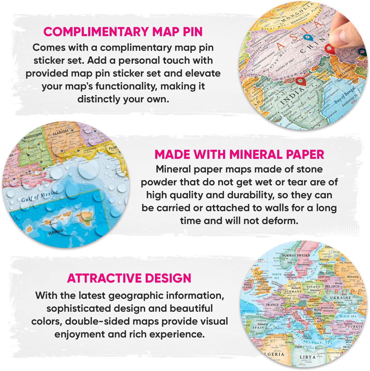 AquaShield Double-Sided World and USA Map Waterproof Tow Wall Map Set 24×36 – Folded Edition with (Pin Stickers)