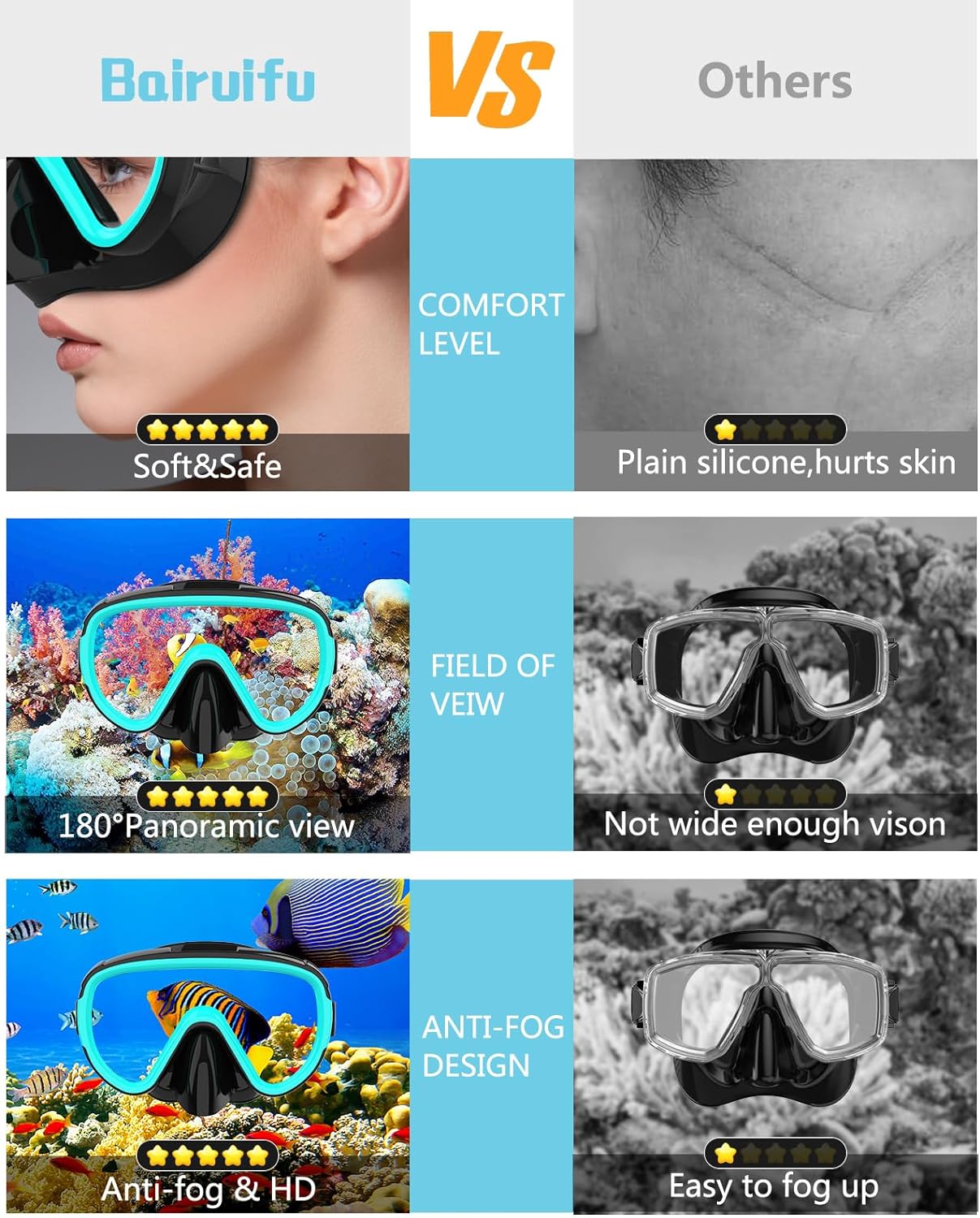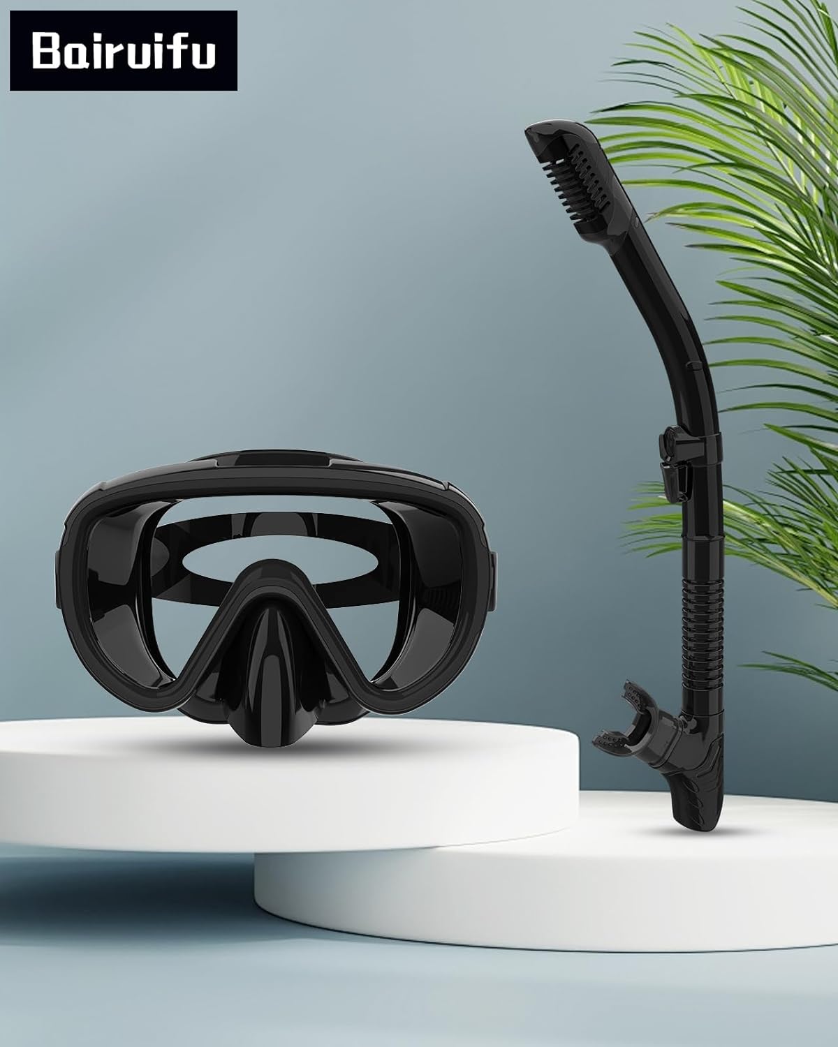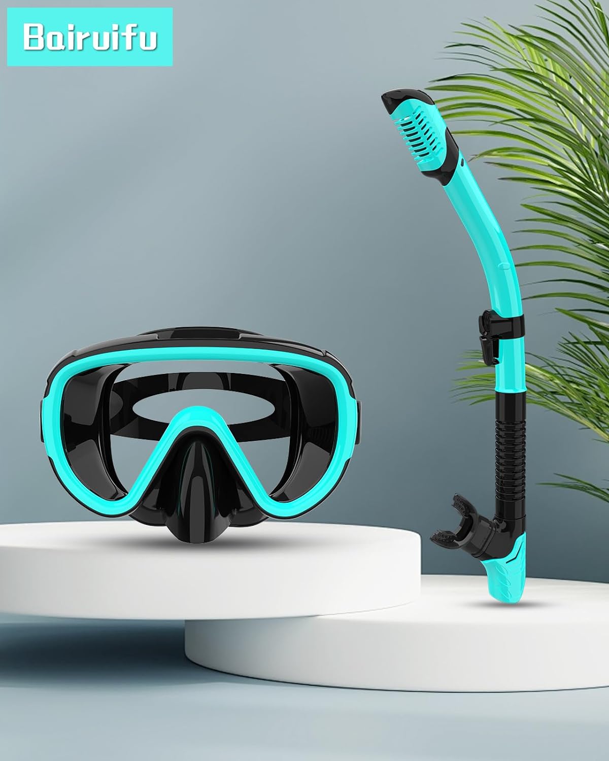 Bairuifu 2024 version snorkeling suit has the following advantages: 1. Large area tempered glass, high-definition lens, increased field of view by 25%