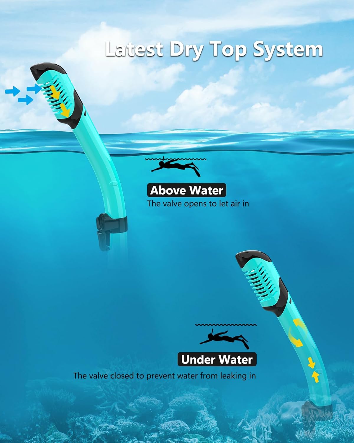 【Safety Snorkel】When the top of the snorkeling tube enters the water, the valve closes to prevent water from entering; when the top of the snorkeling tube is above the water, the valve opens to let air in, making it easier to breathe.