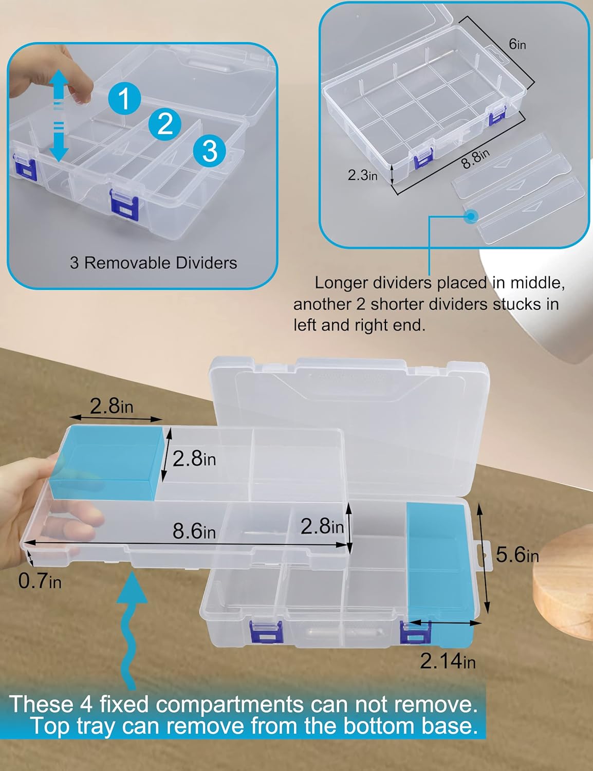 Compartment Storage Box: 3 same squares (2.8×2.8×0.7in) and 1 long compartment (8.6×2.8xin), these 4 fixed compartments can not remove. Top tray can remove from the bottom base for simple organization.