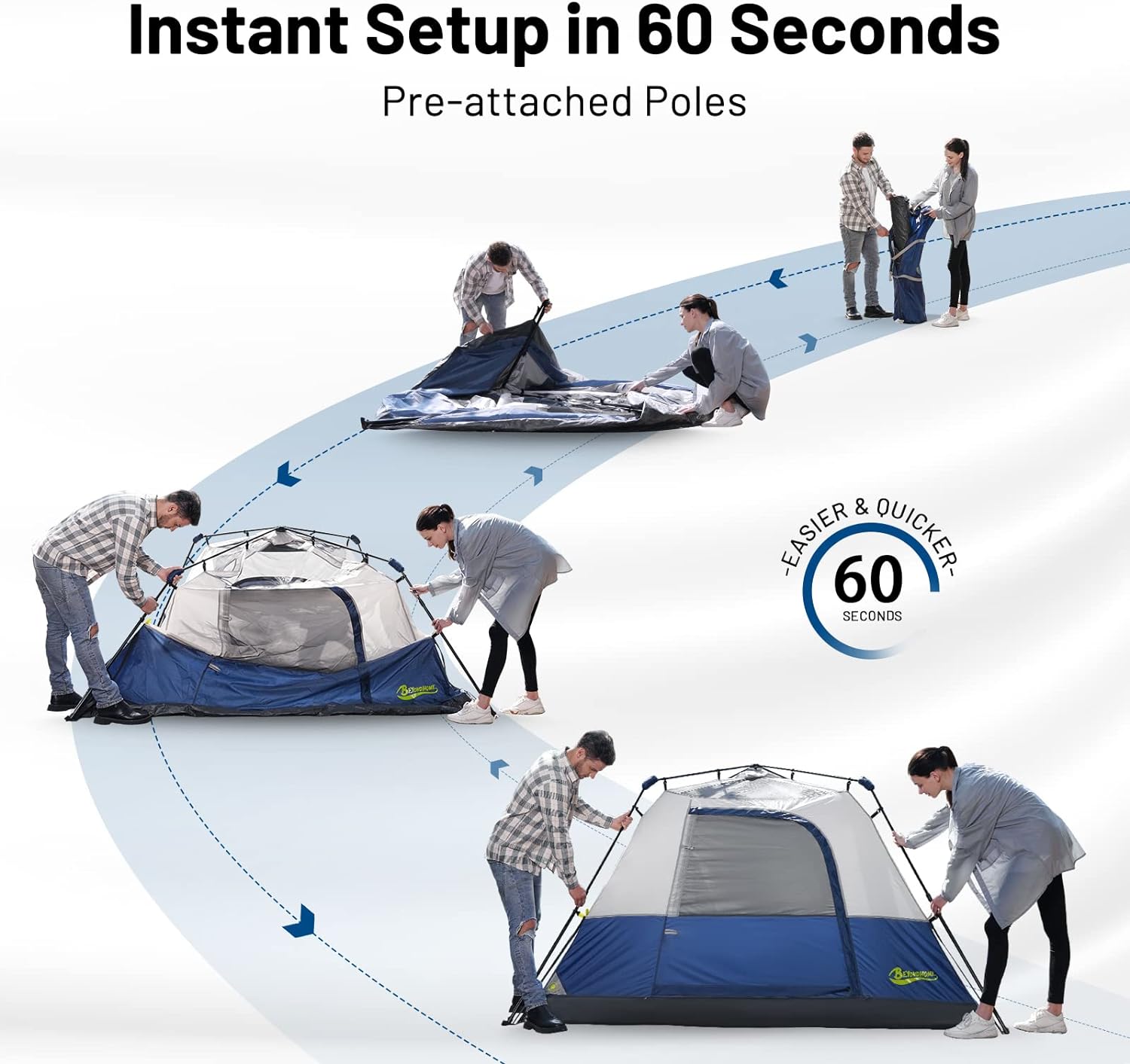【Pick a Campsite, Pitch in Seconds】 Set up the camping tent in merely 60 seconds. Our instant cabin tent is not only roomy, weather-proof, and sturdy, the installation is a breeze. The pre-attached poles collapse easily in place to ensure you are never scrambling to decipher which pole goes where. Our unique approach makes the assembly simple and intuitive. So, spend more quality time with your family or group at the campsite, taking any complex assembly out of the equation.