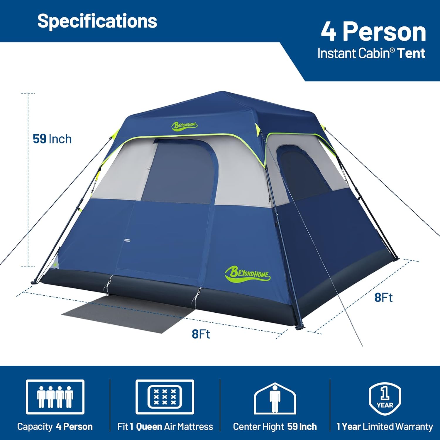 【Spacious & Lightweight】The instant cabin camping tent is 8ft x 8ft and fits a queen-size mattress in it easily with plenty of extra space. With a peak height of 59 in, you can stand fully upright when changing clothes. The weight is only 14.5lbs, even girls can easily carry the tent to the campsite from the car.