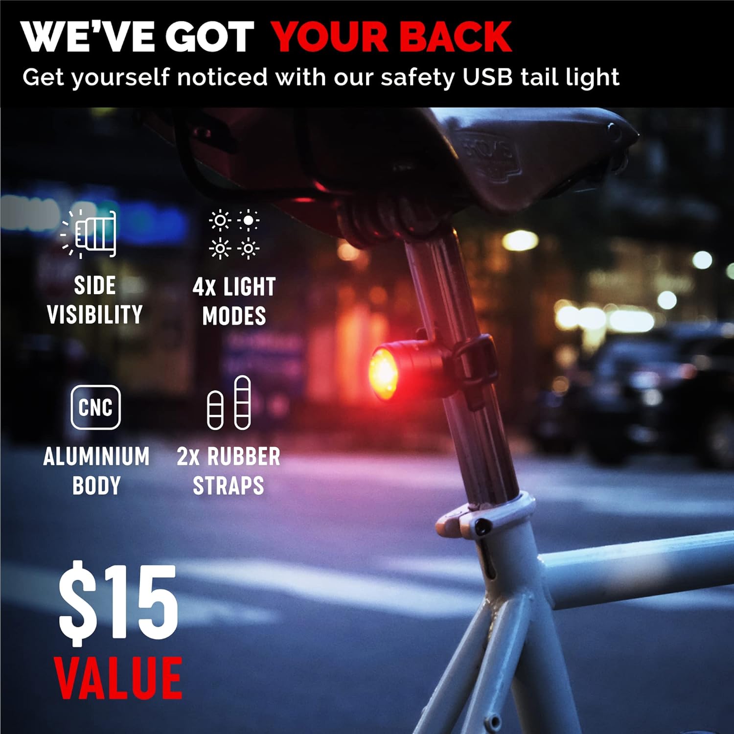 USB Rechargeable LED bike tail light Included with wide angle visibility and 5 working modes plus easy on easy off silicone rubber strap.