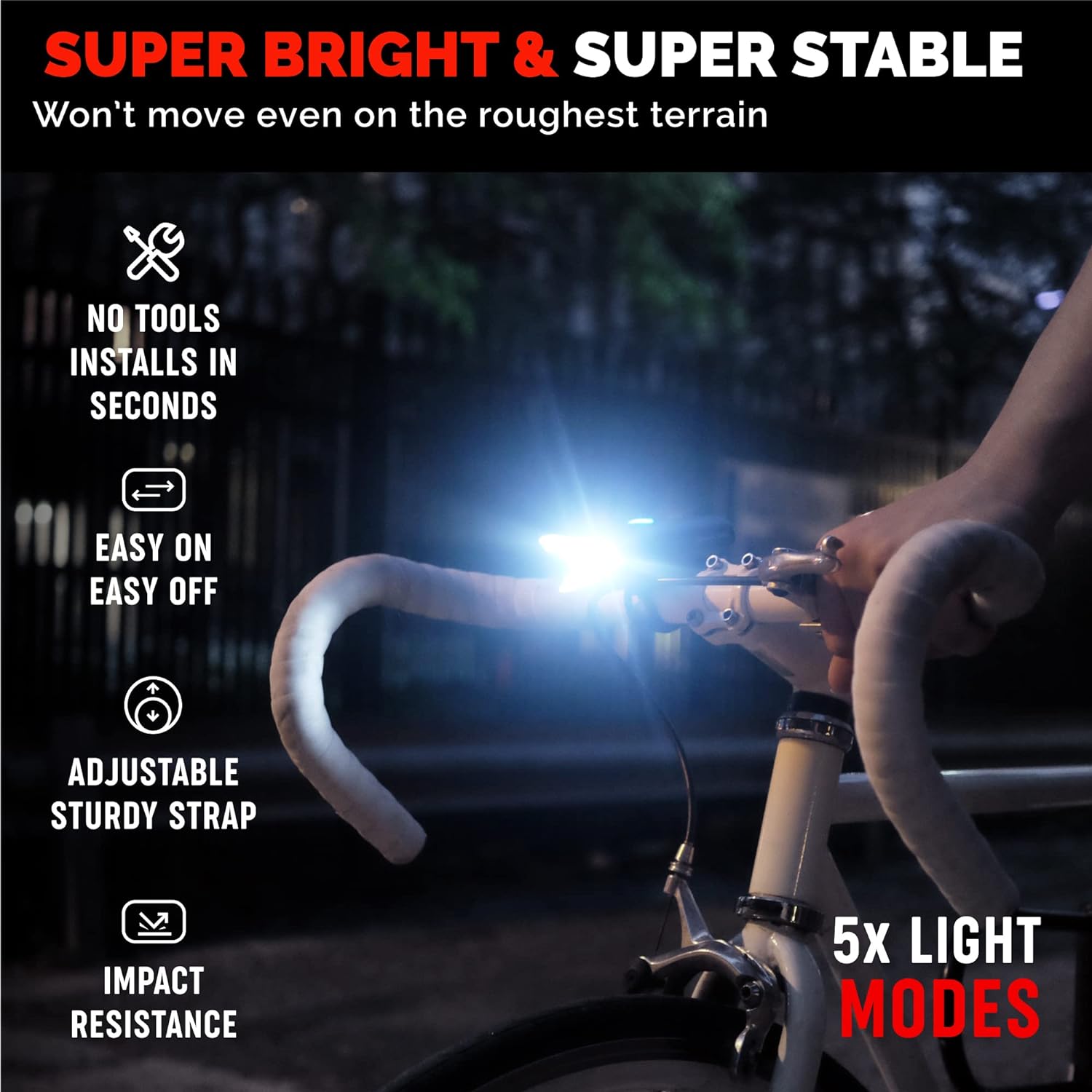 FLAT BEAM & FIVE LIGHT MODES – Have the light where you need it the most, on the ROAD. Our Bicycle headlight offers 5 different lighting modes: full brightness, half, low, flashing and pulsing mode.