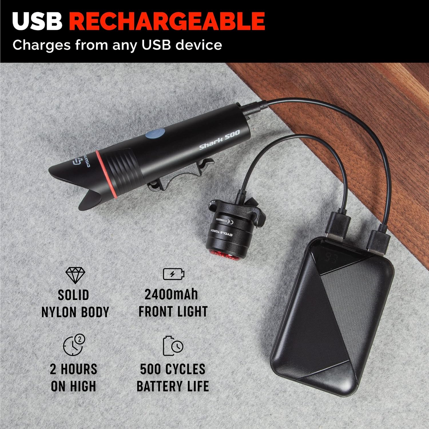 SUPER-BRIGHT USB rechargeable bicycle light with 500 lumens & amazing long run time.The Shark 500 Light has a runtime of up to 2 hours on high & 30 hours on Flash.
