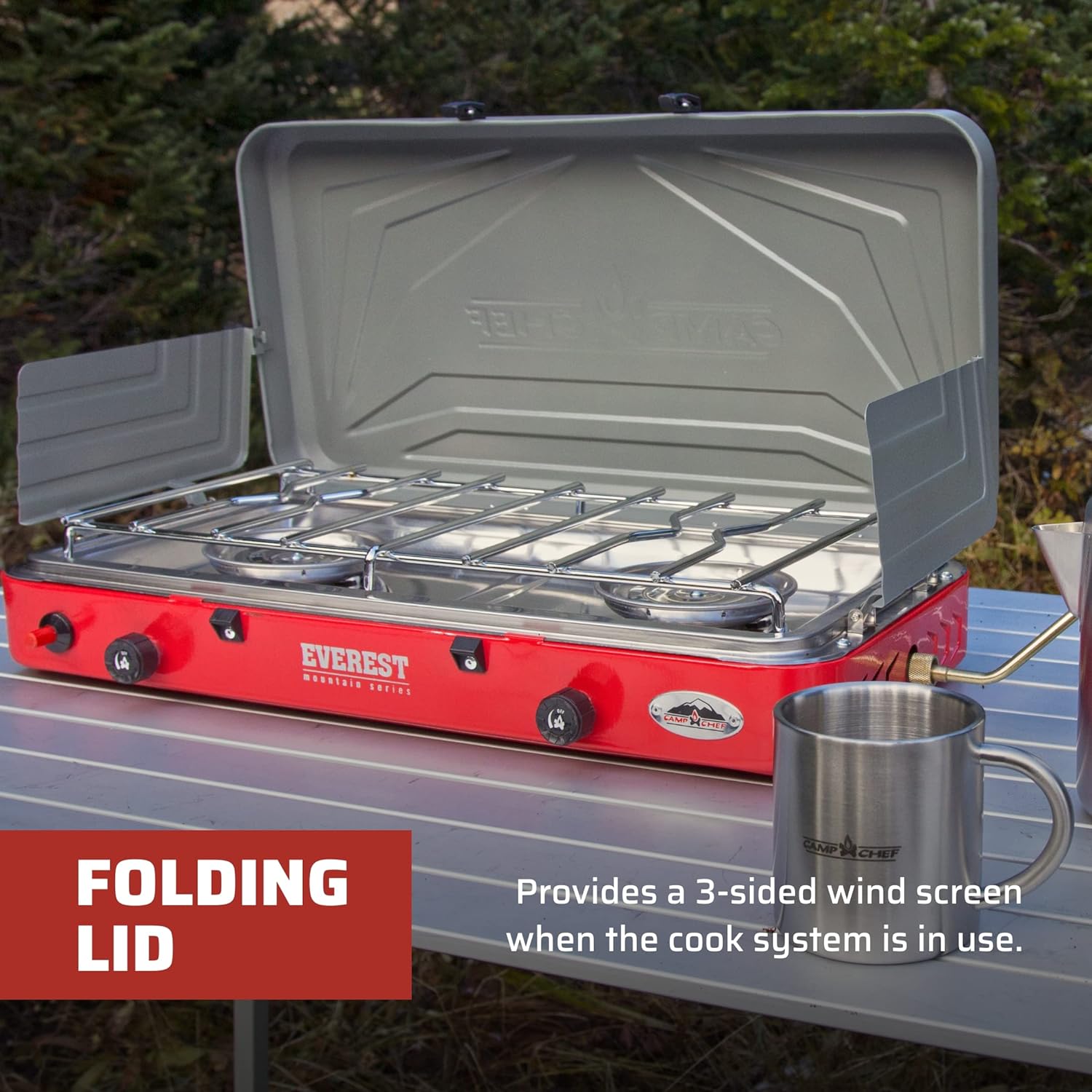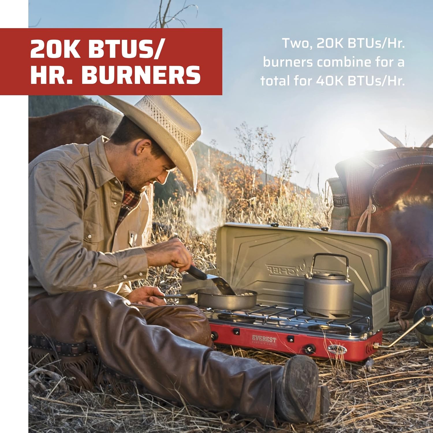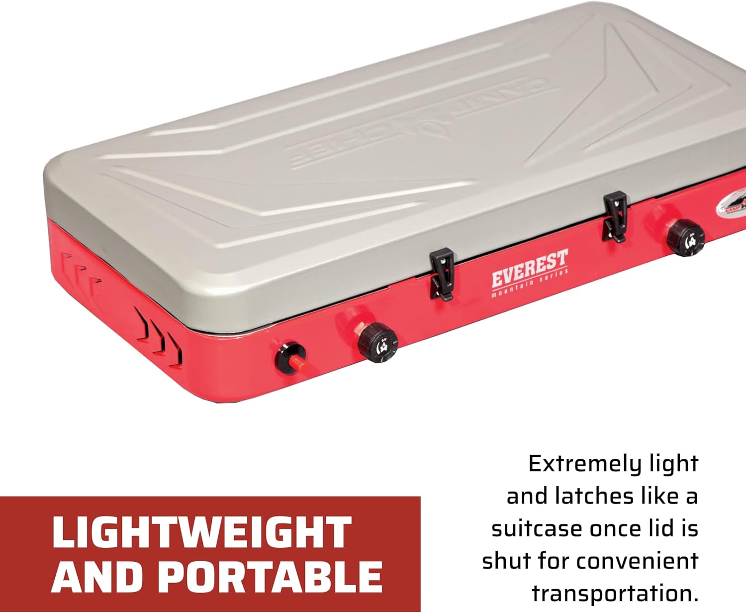 Powerful Two Burner Stove: Everest’s two 20,000 BTU burners are powerful for your cooking needs; lightweight and portable camp stove has a latch lid