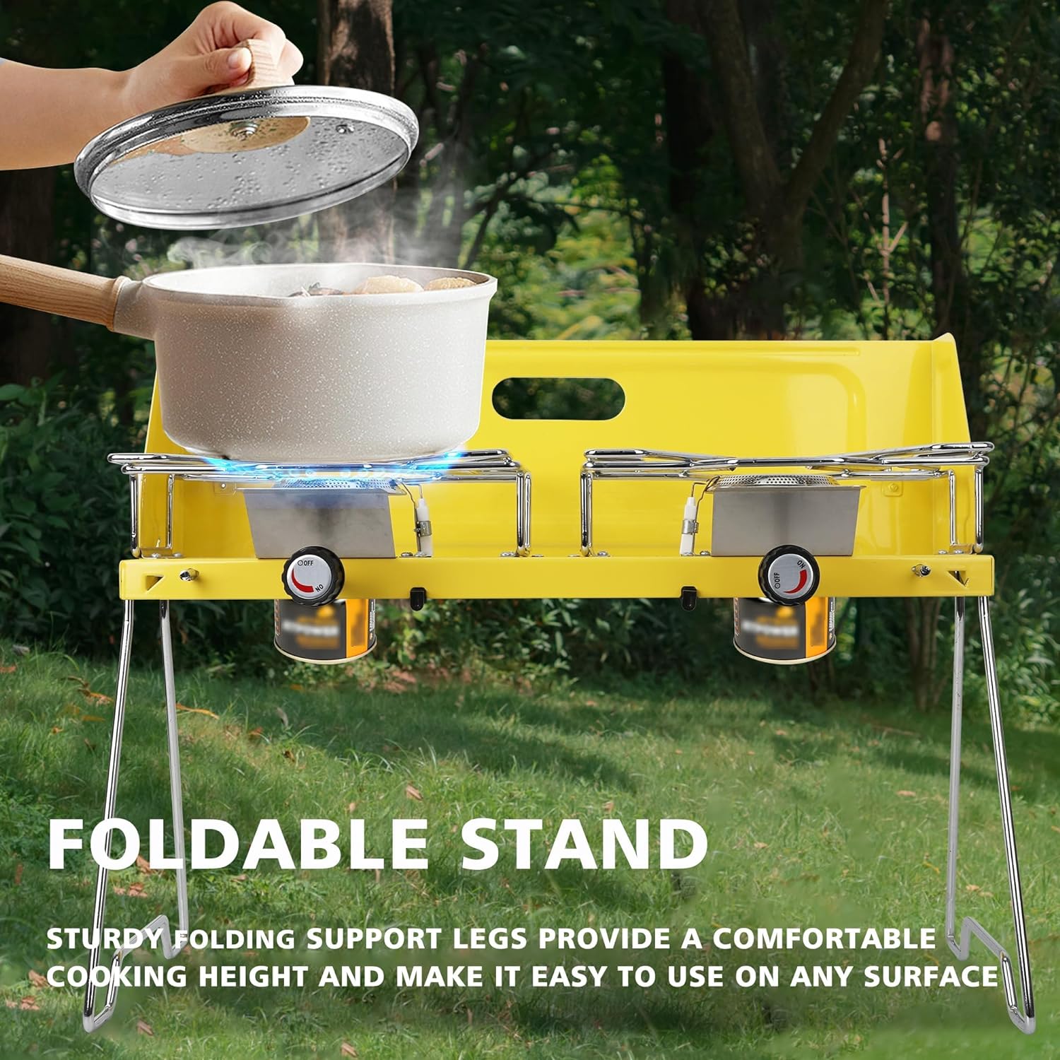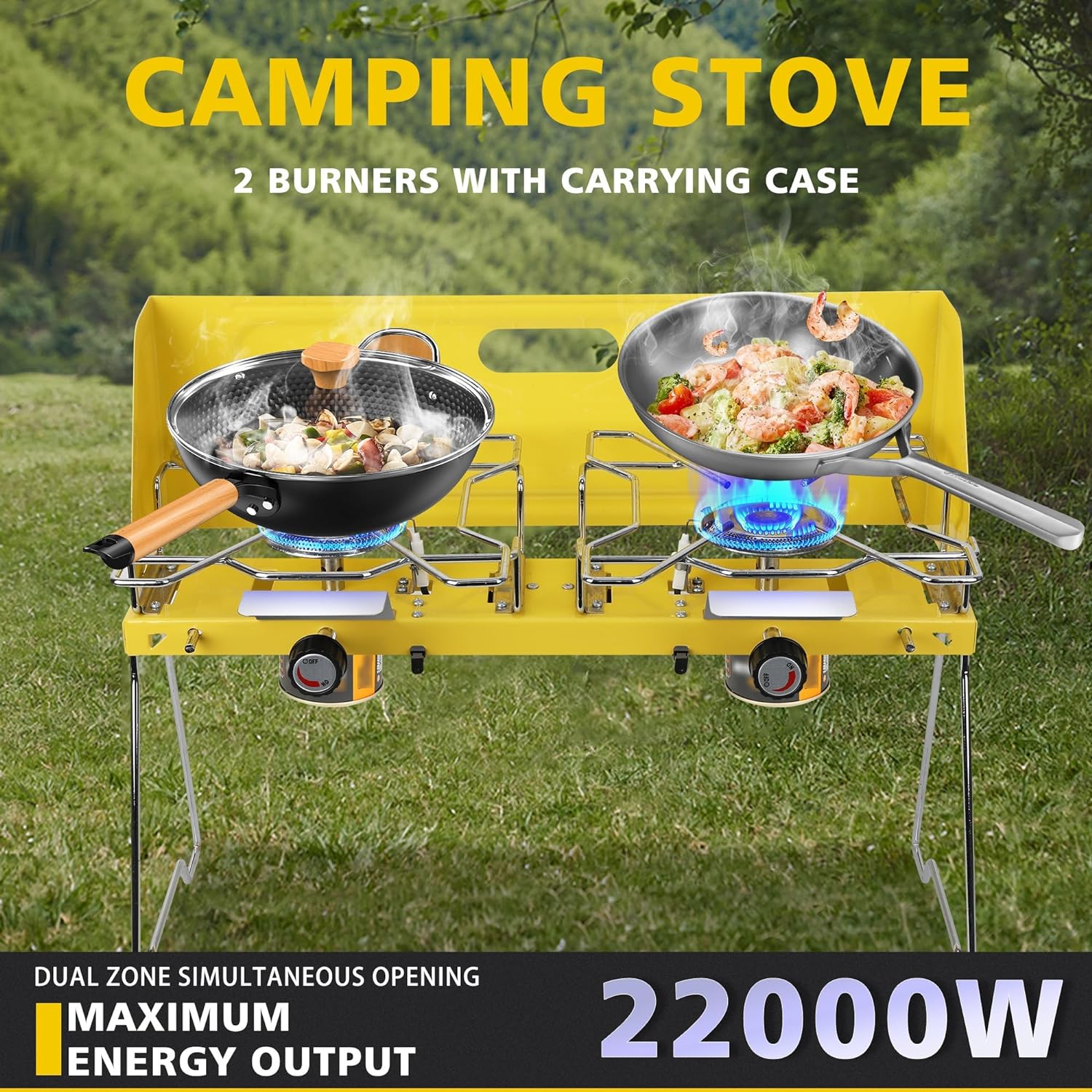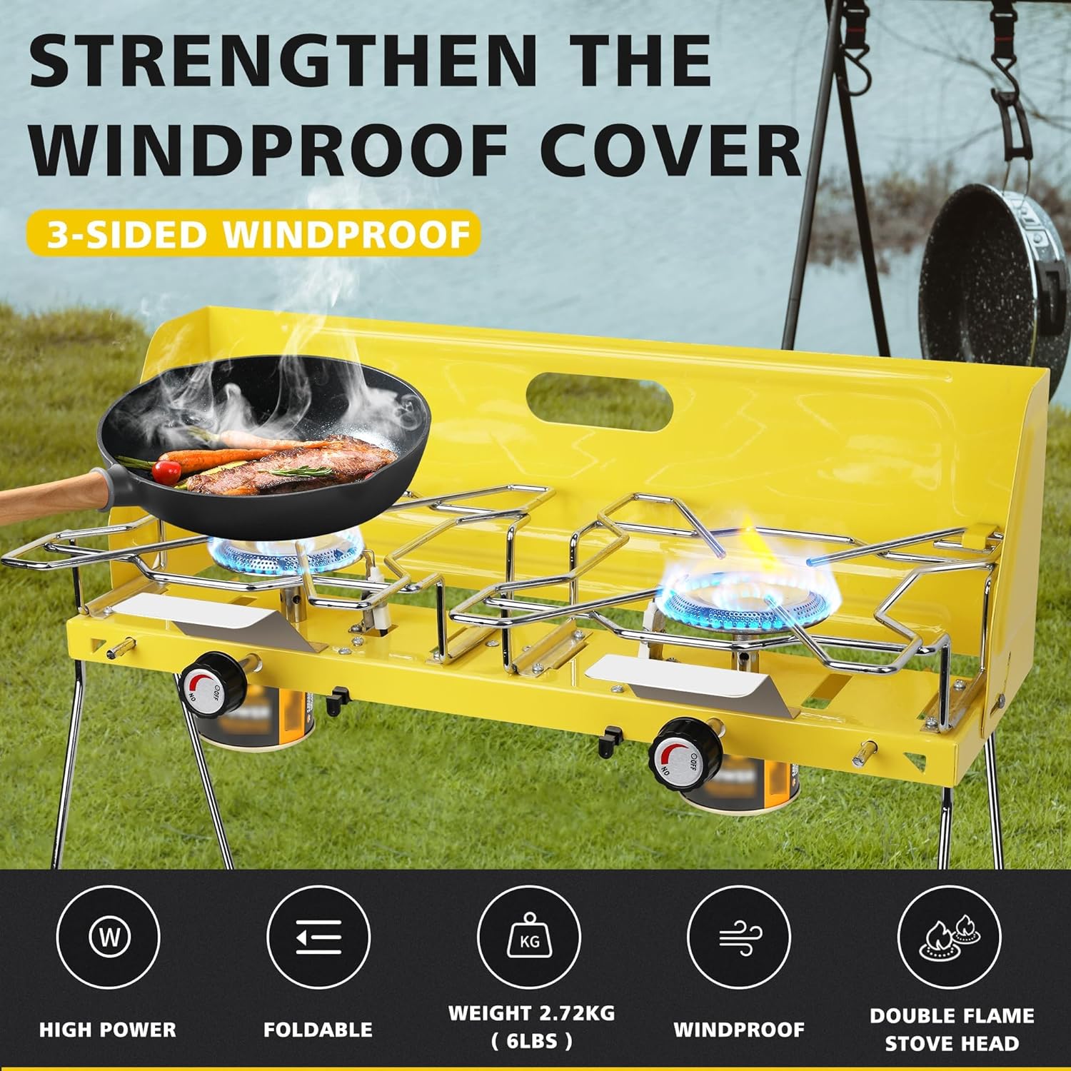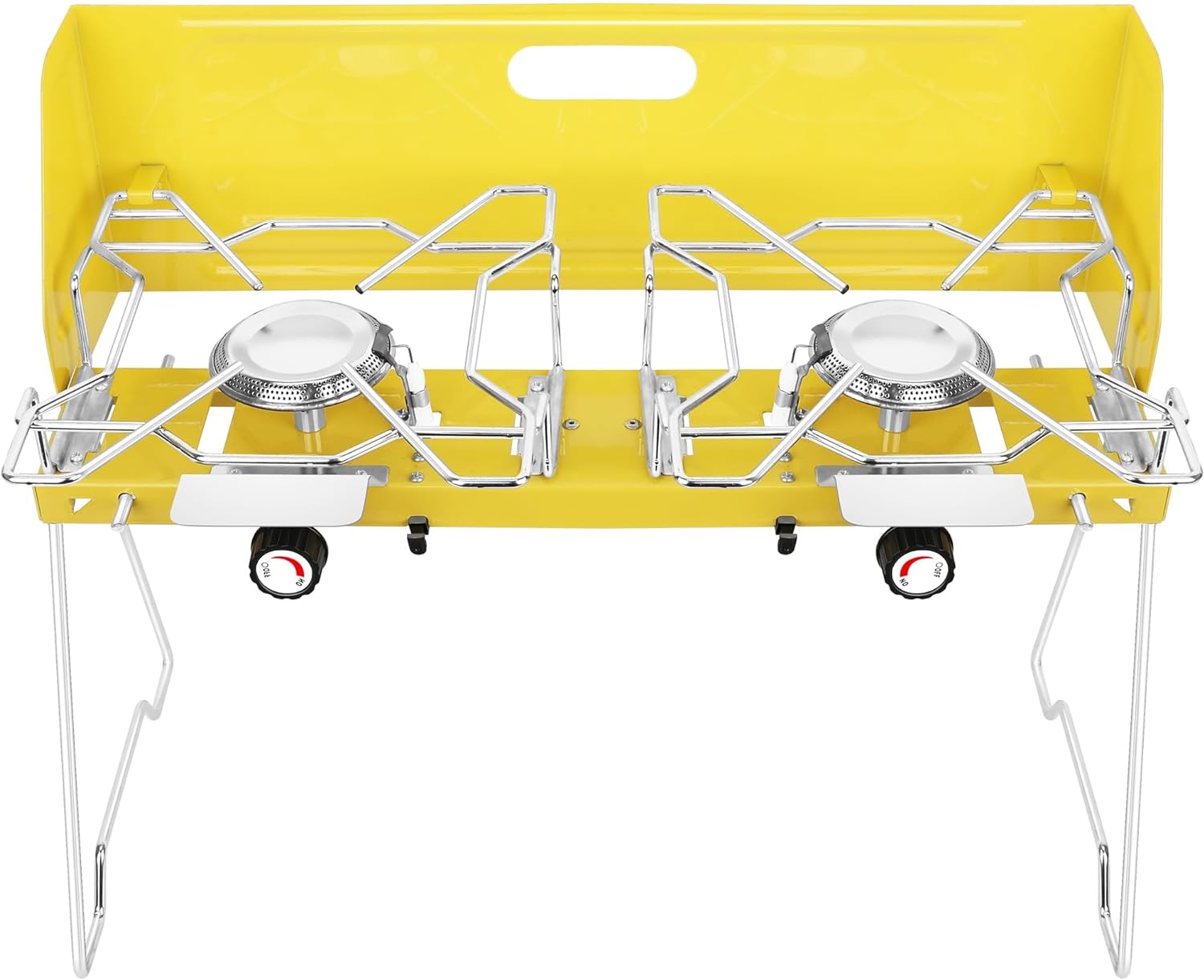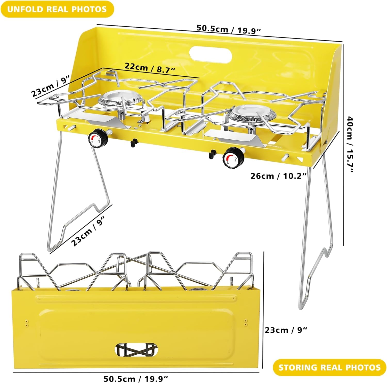 Adjustable Wind Shield: The camping stove has a built-in adjustable wind shield to protect the flame from wind and improve the burning efficiency,Improved Knob Rotation: Built-in electric ignition for precise temperature and simmering control of two independently adjustable burners.