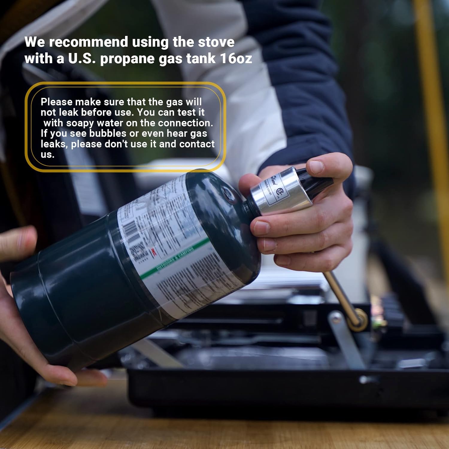 NOTICE:Please make sure that the gas will not leak before use. You can test it with soapy water on the connection. If you see bubbles or even hear gas leaks, please don’t use it and contact us.And please contact us if you have any quality problems.