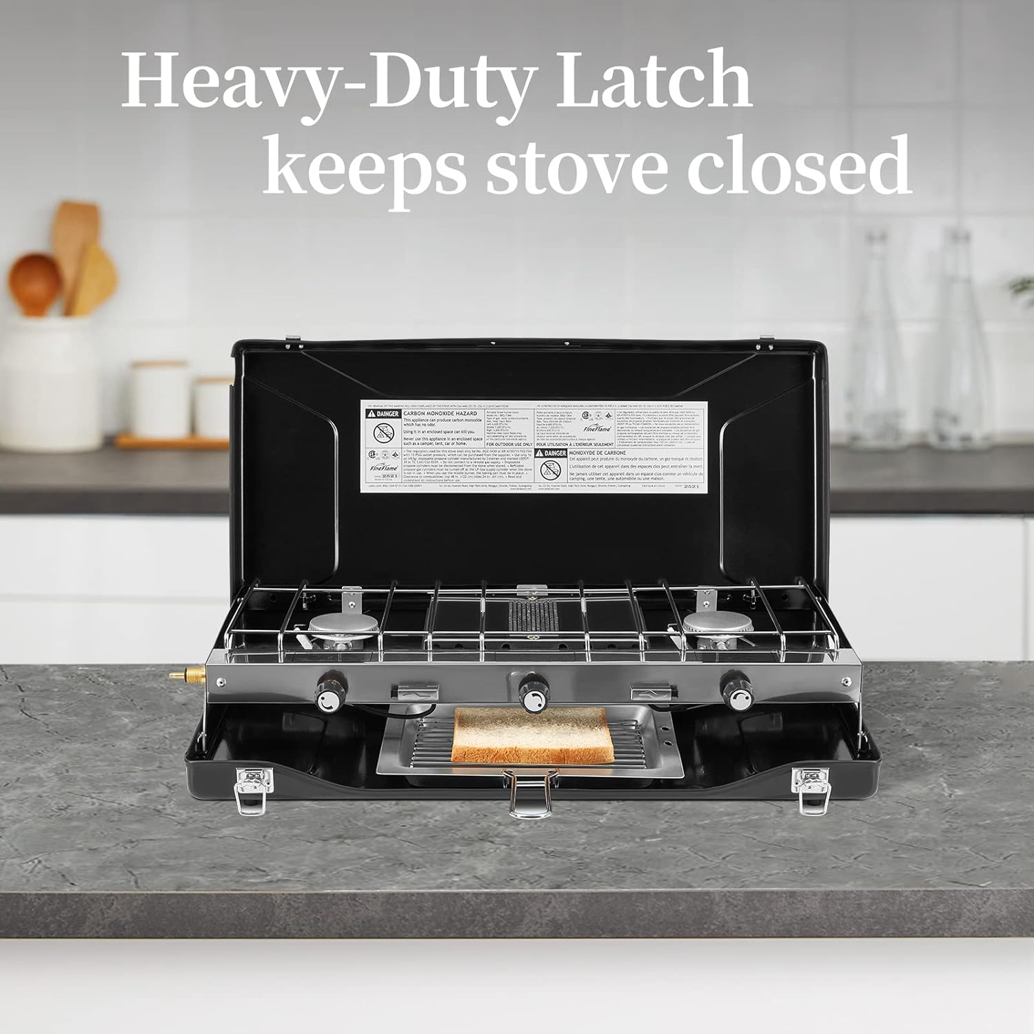 ADJUSTABLE 3 BURNERS : This camping gas stove is equipped with 3 independently adjustable knobs, two of Piezo ignition burners with 6,600 BTU power. The middle downward burner is designed for toasting, 7200BTU power and requires manual ignition. We recommend that you use a piezo lighter. It relies on heat radiation to heat and won’t burn the toast