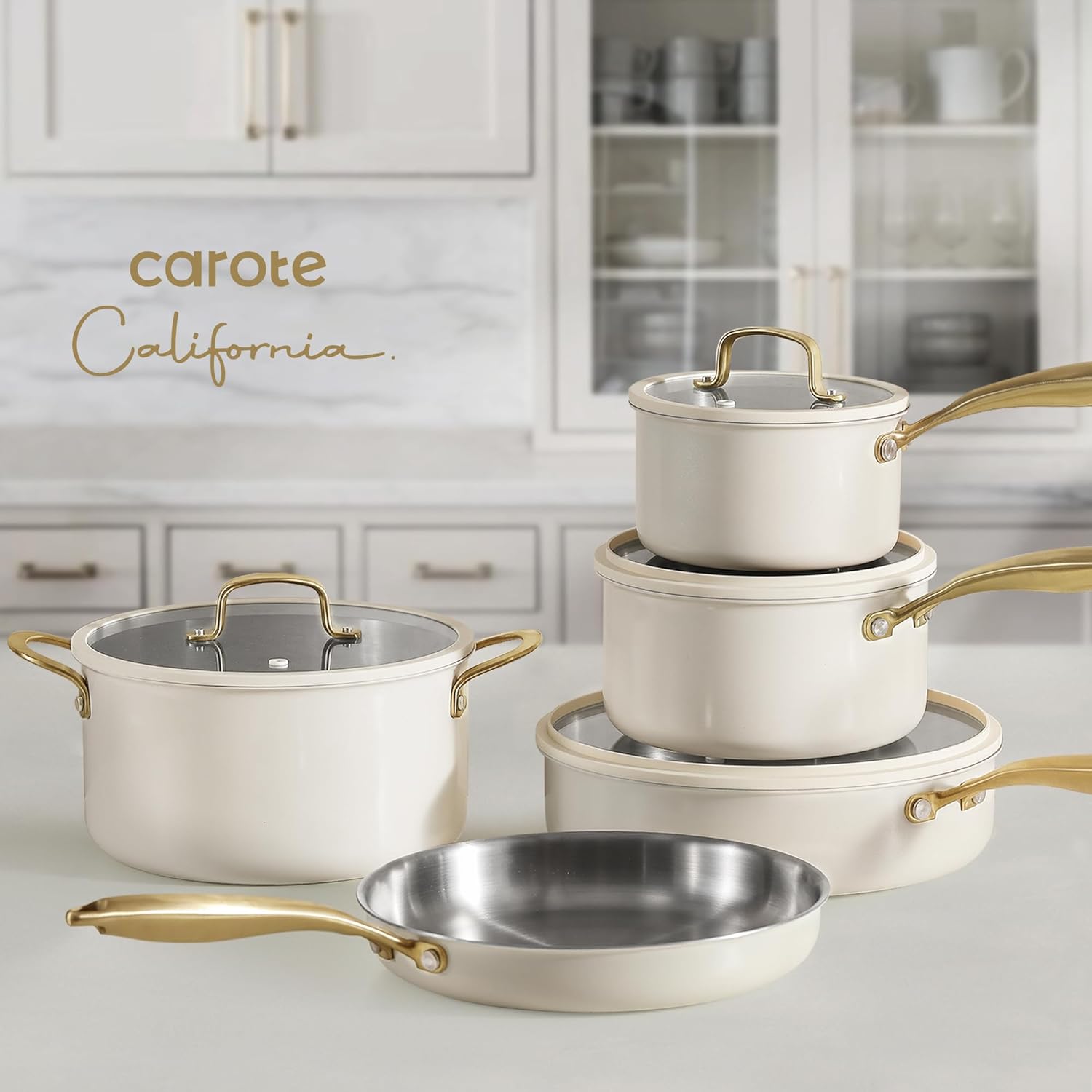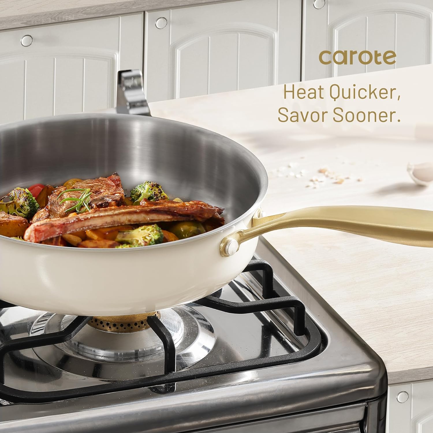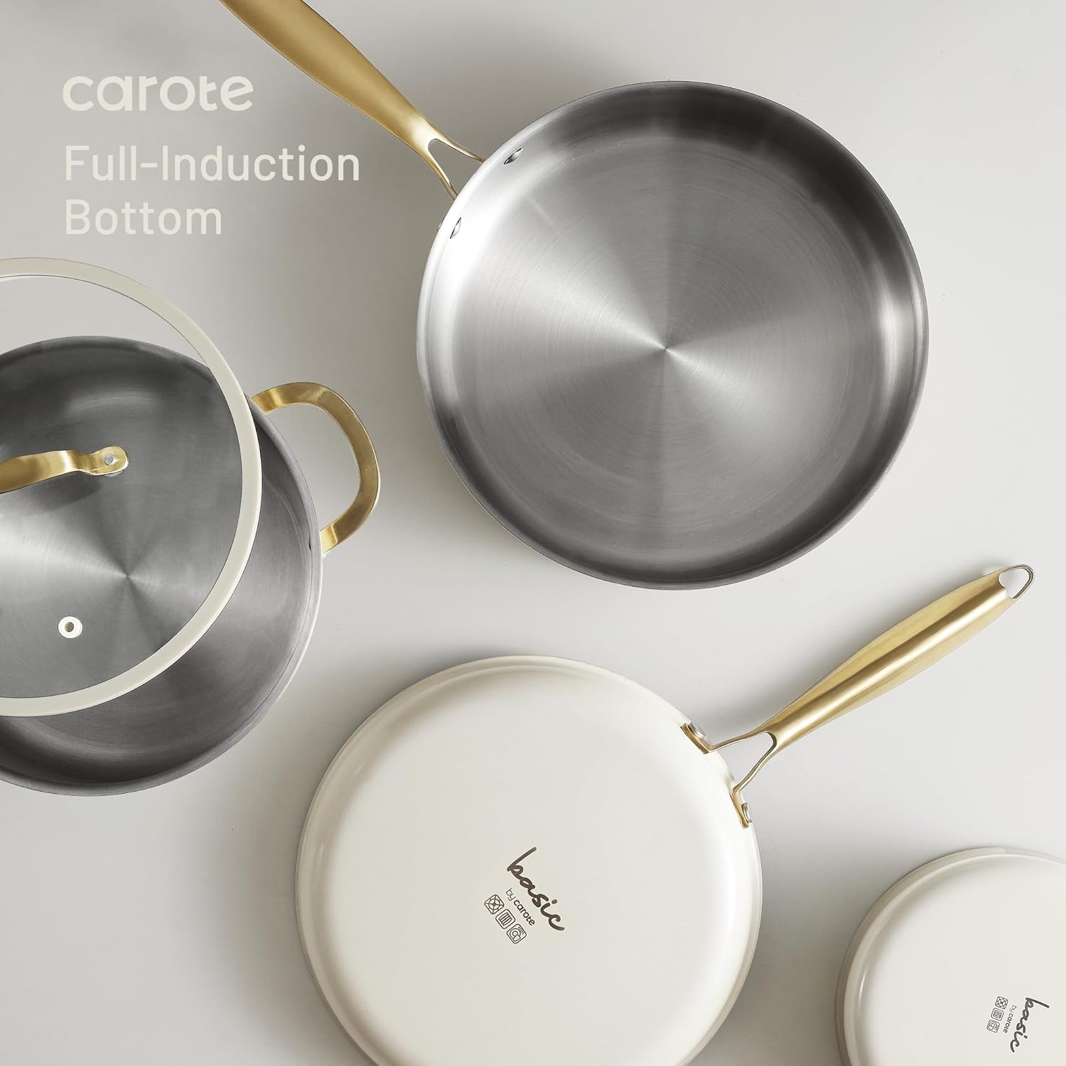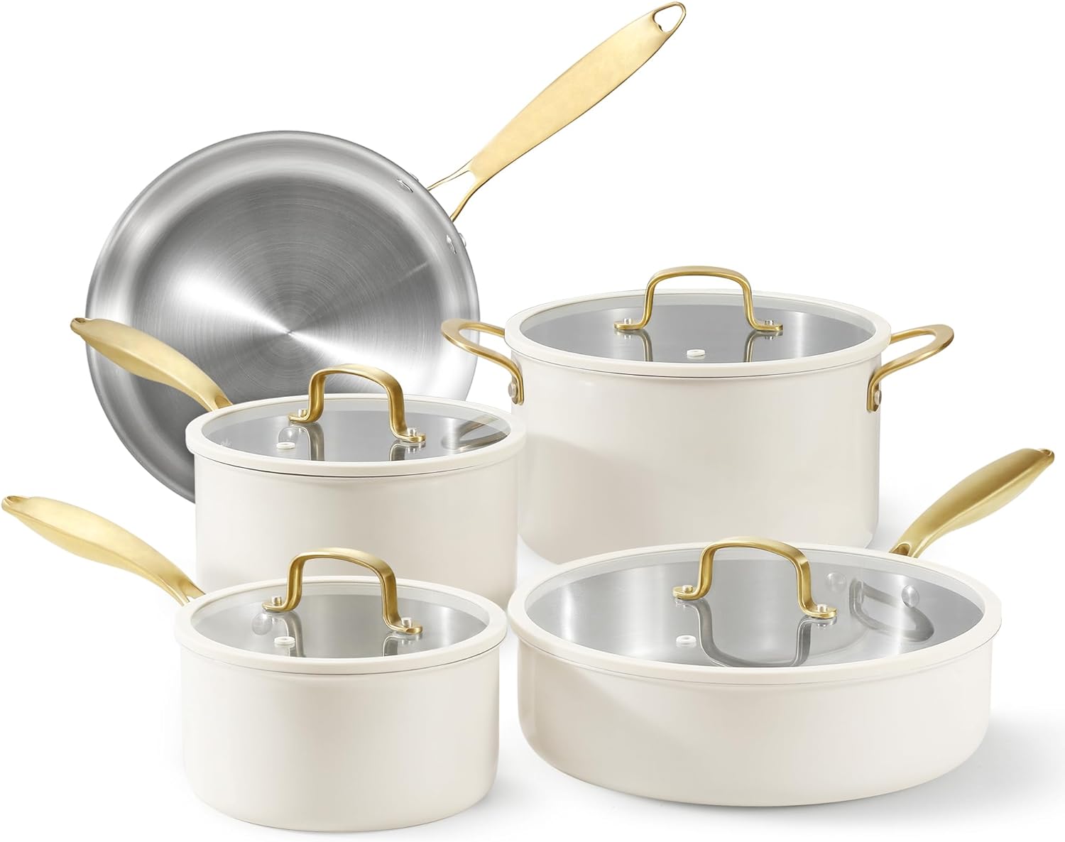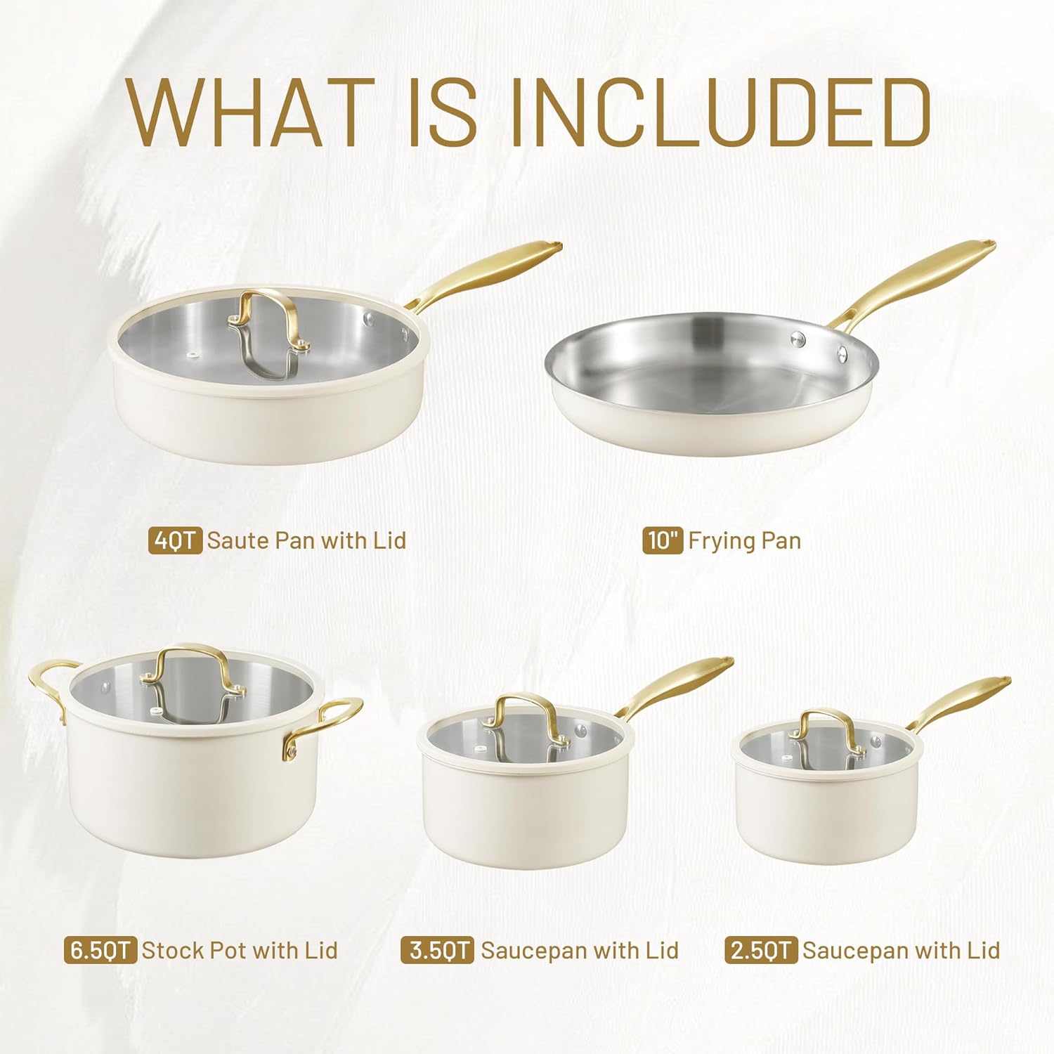 ππππ’π ππππππππ: A cookware set for all cooking occasions, include 10″ Frying Pan, 4QT Saute Pan with Lid, 6.5QT Stock Pot with Lid, 2.5QT Sauce Pan with Lid, 3.5QT Sauce Pan with Lid.