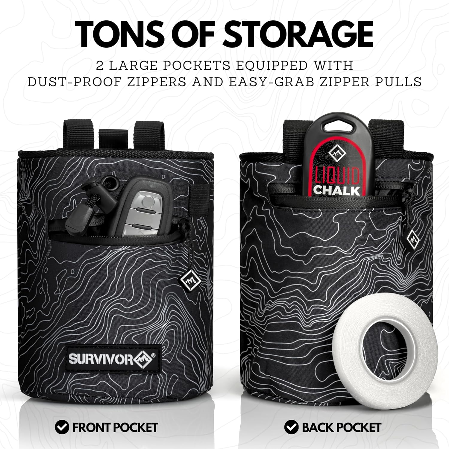 ✔️TONS OF STORAGE – Our rock climbing bag features 2 extra large pockets allowing you to store all of the necessities. Keys, phone, rock climbing accessories, and even a little snack can all come with you and stay secure in the water-resistant pockets. All of the Survivor rock climbing chalk bags, buckets, and other rock climbing and bouldering gear is made by climbers for climbers. We’ve thought of everything so you can focus on the climbing!