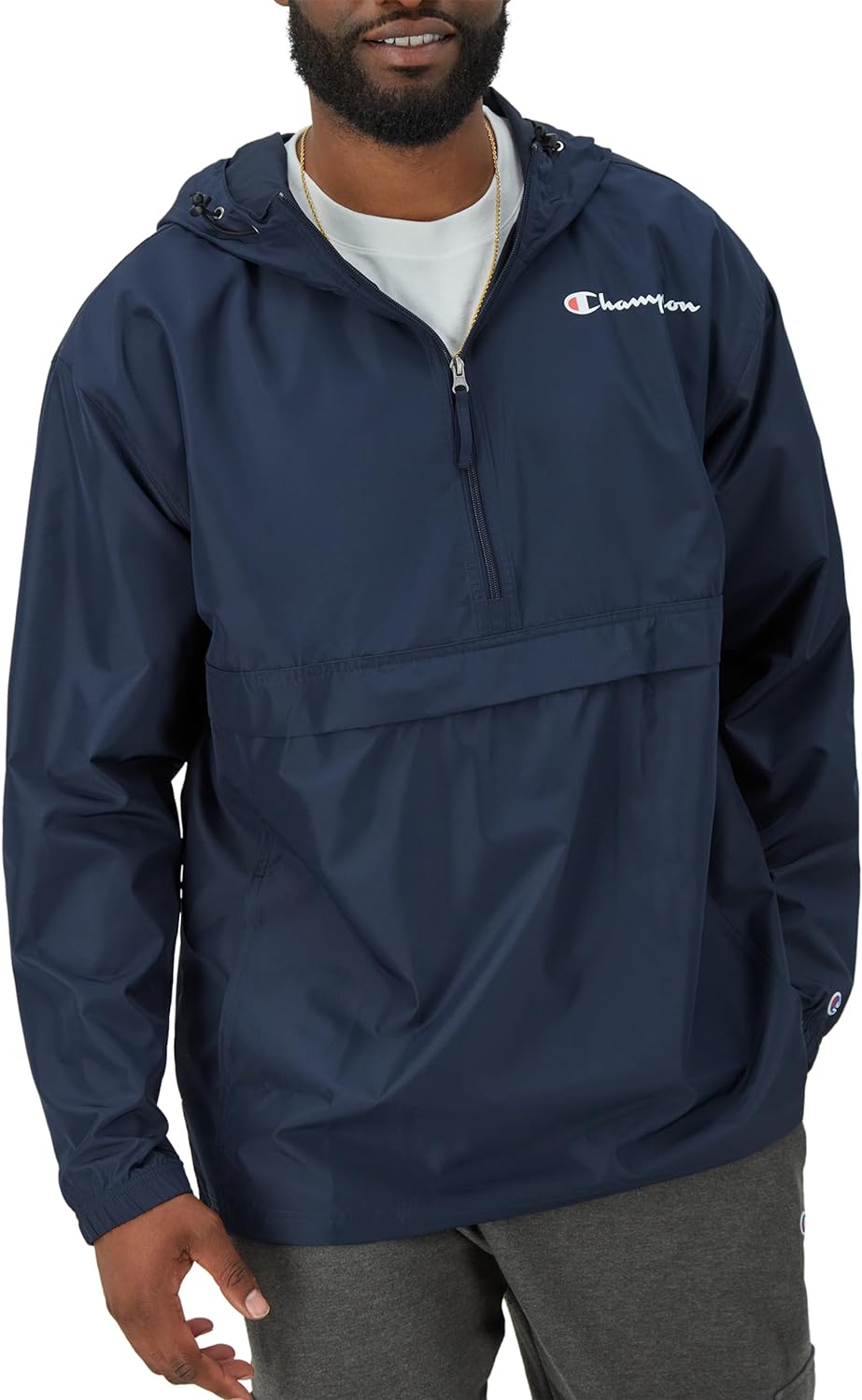 PACK IT UP & GO. Wind and water-resistant, this ultra-lightweight unisex jacket can be towed along on all your outdoor endeavors. Pack it up into the front pocket and stow it away so you’ll always be ready when the weather takes a turn. This jacket for men and women features a half-zip front, scuba-style neckline, and a hood with a bungee cord closure for ultimate protection. Unisex fit is roomy enough for easy layering over sweatshirts and long-sleeve tees. The iconic script logo at the left chest is recognizable on and off the field.