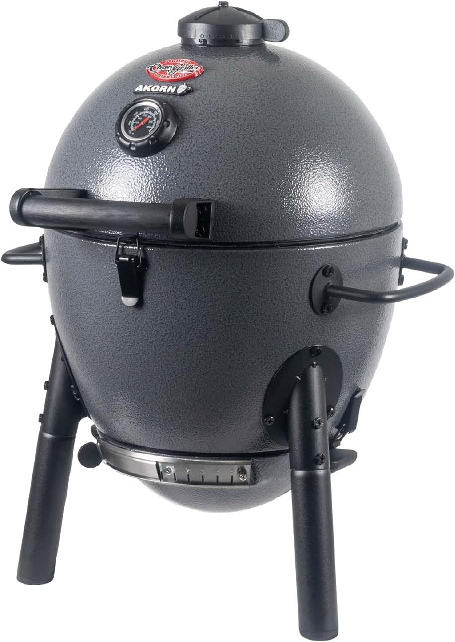 The Char-Griller Akorn Jr. Kamado portable Charcoal grill features dual dampers, heat Gauge, & Triple wall steel with insulation to deliver a superior grilling experience. The cast iron cooking grates keep flare-ups low & you can grill more with less charcoal. Our easy dump ash pan makes cleans up quick & easy, The hinged lid allows for easy access & keeps the lid in place while you cook. The AKORN Jr. Kamado offers easy mobility & portability with built in handles & a locking lid. Perfect for tailgating, camping, Park grilling or backyard barbecuing. Primary cooking area: 153 square inches.