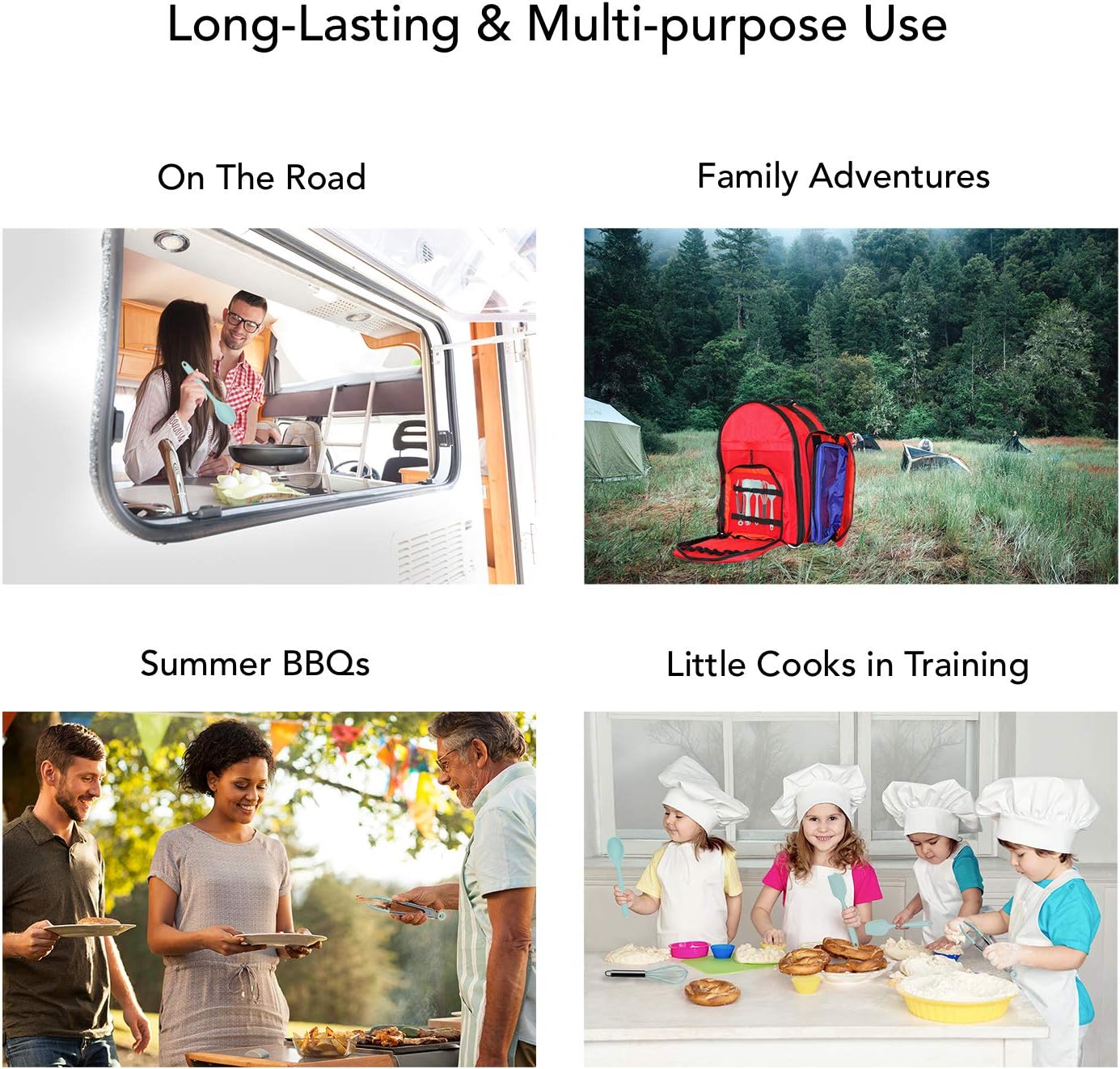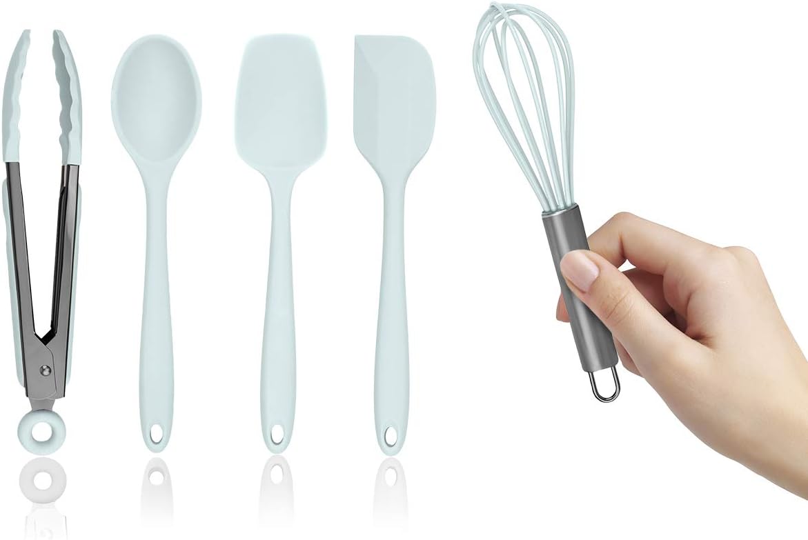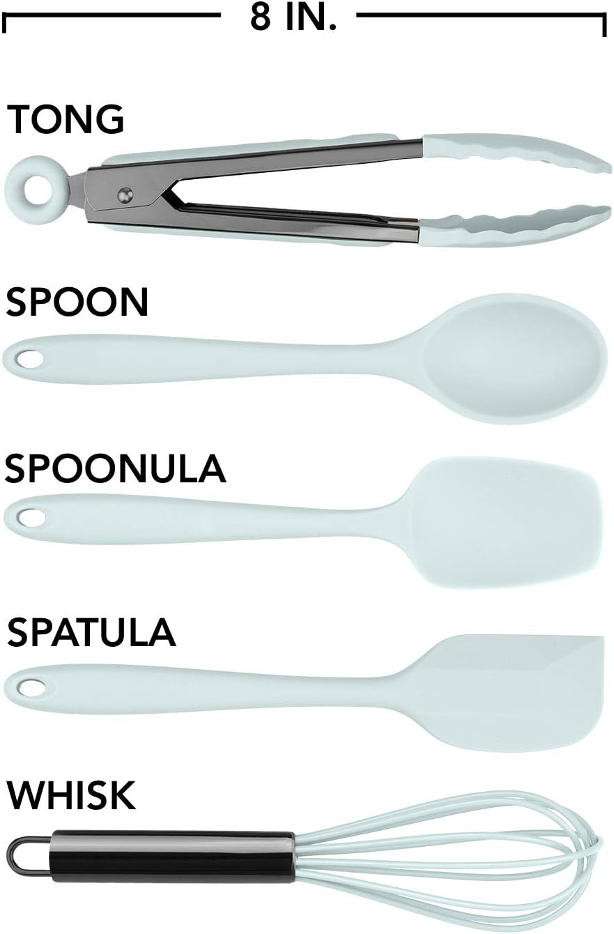 SET INCLUDES – 1 mini tong, 1 mini spoonula, 1 mini spatula, 1 mini spoonula and 1 mini whisk; a completely functional set that will cover all your basic kitchen needs from stirring, frying, and tasting to serving. All mini utensils measure 8” long. Heat resistant up to 400° F.
