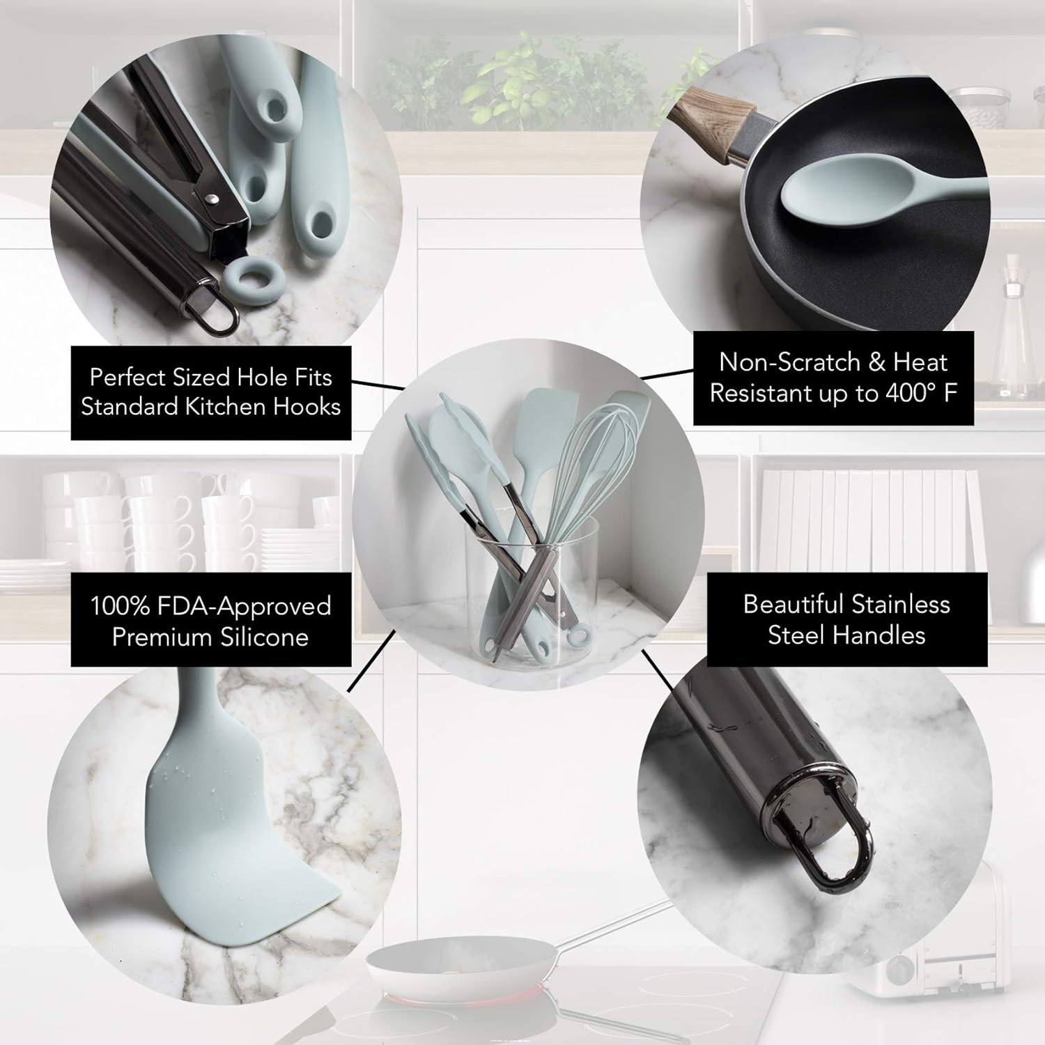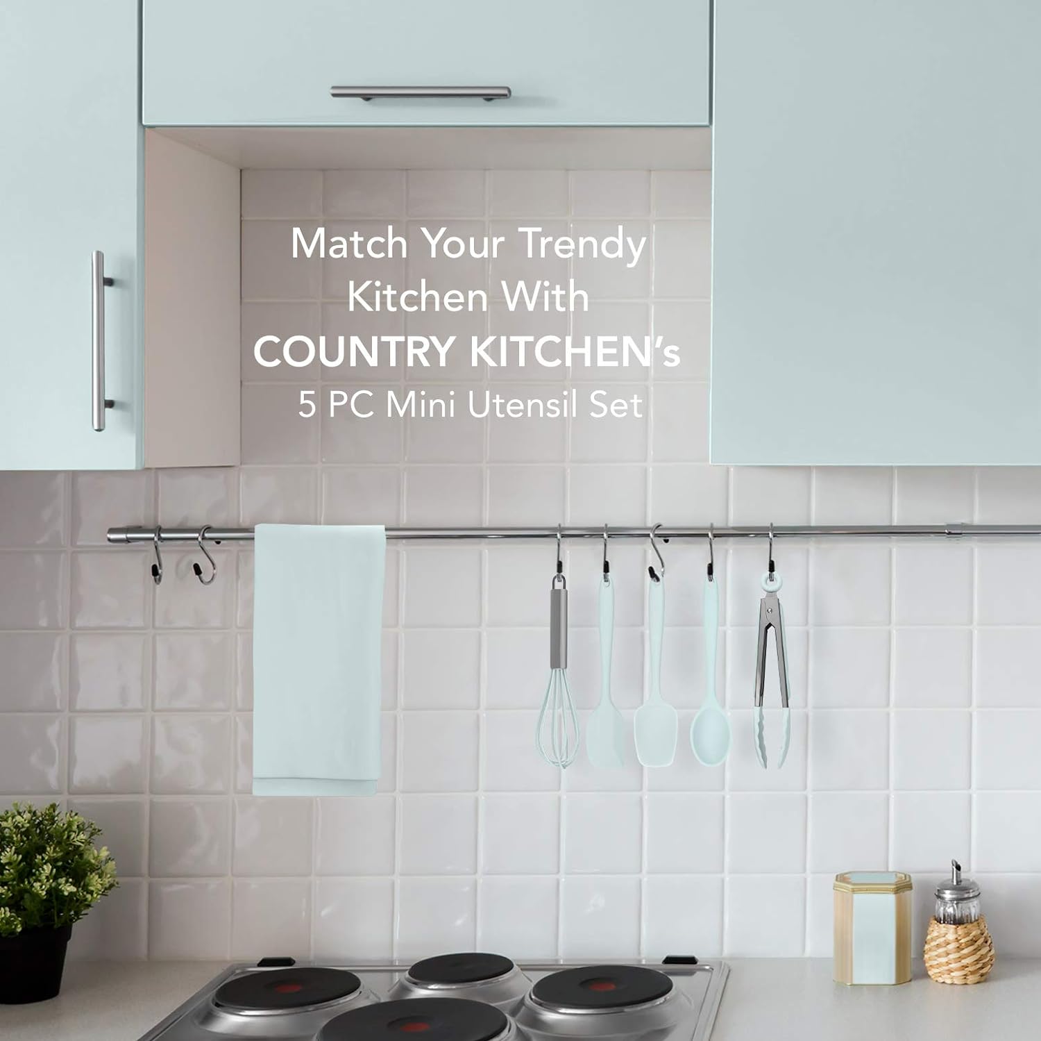 REFRESHING AND STYLISH – Designed in a fresh and bright mint green color and a gunmetal metallic tone, this set of mini silicon kitchen tools has an up to date, trendy look that is madly in line with the current styles and trends. Add a splash of color and funk to your kitchen and hang from the rings on each utensil. Cook, bake, grill and serve with fun and fashion at the same time. great for an impressive present as well.
