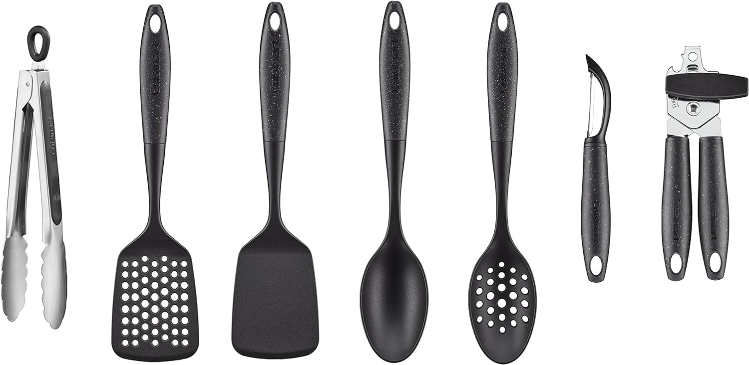 Set Includes: Solid spoon Slotted spoon Solid turner Slotted turner Can opener Peeler 9” Stainless steel tongs