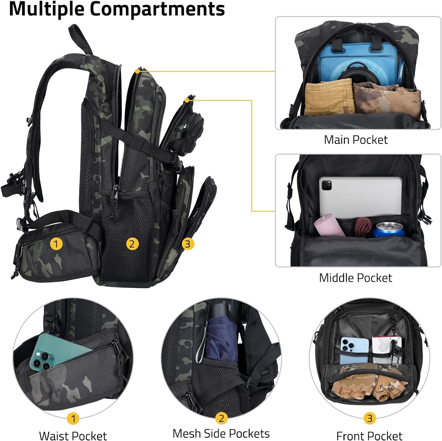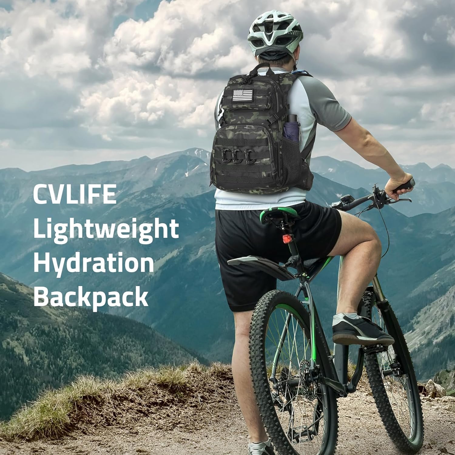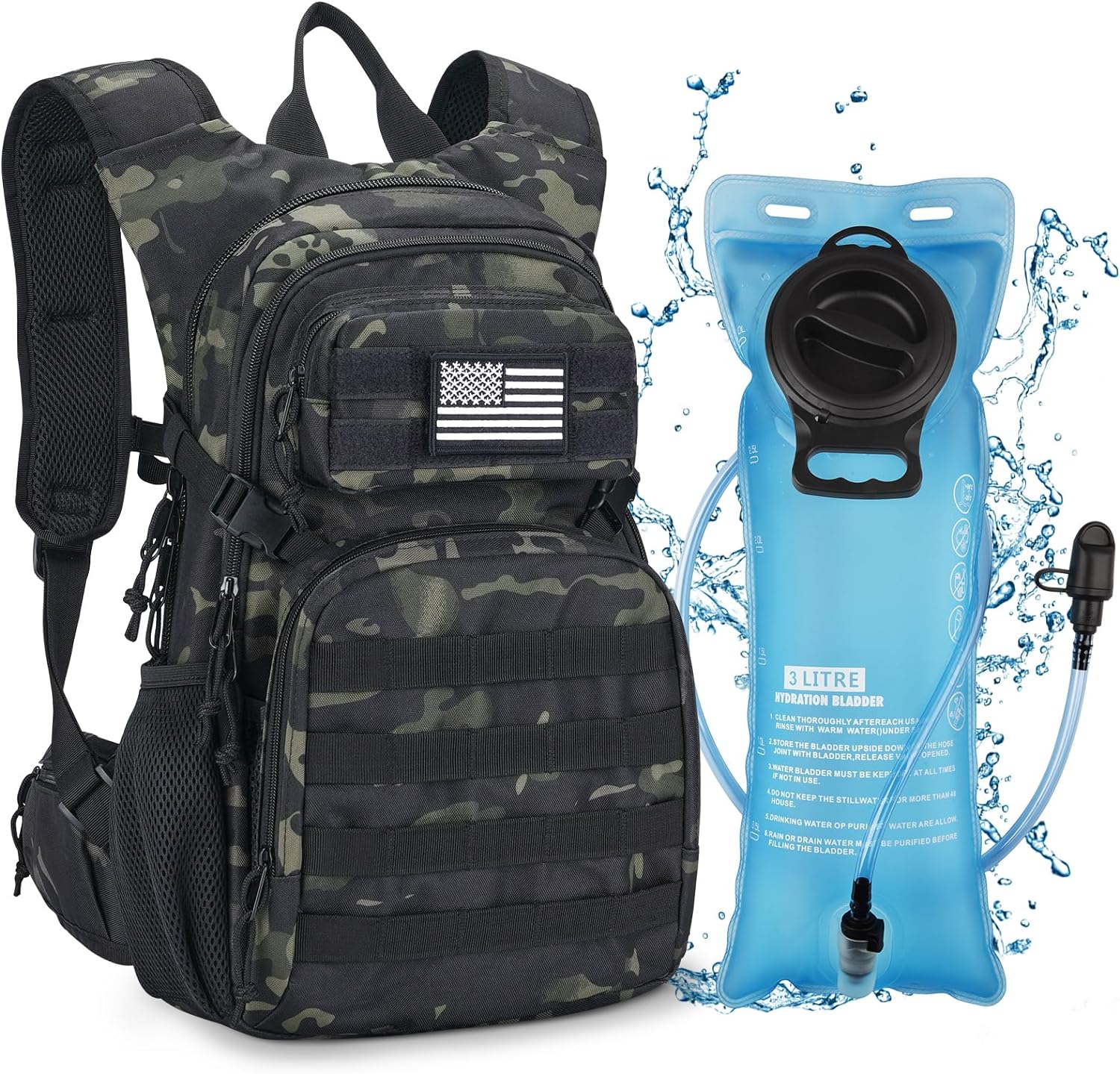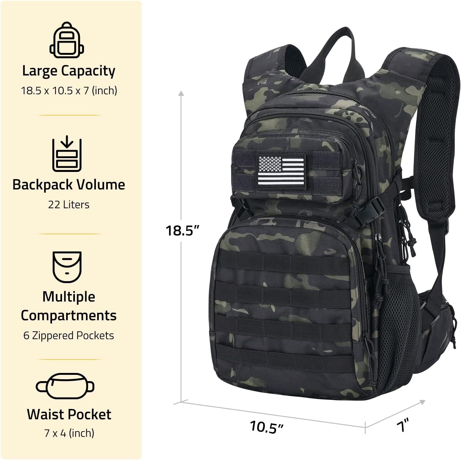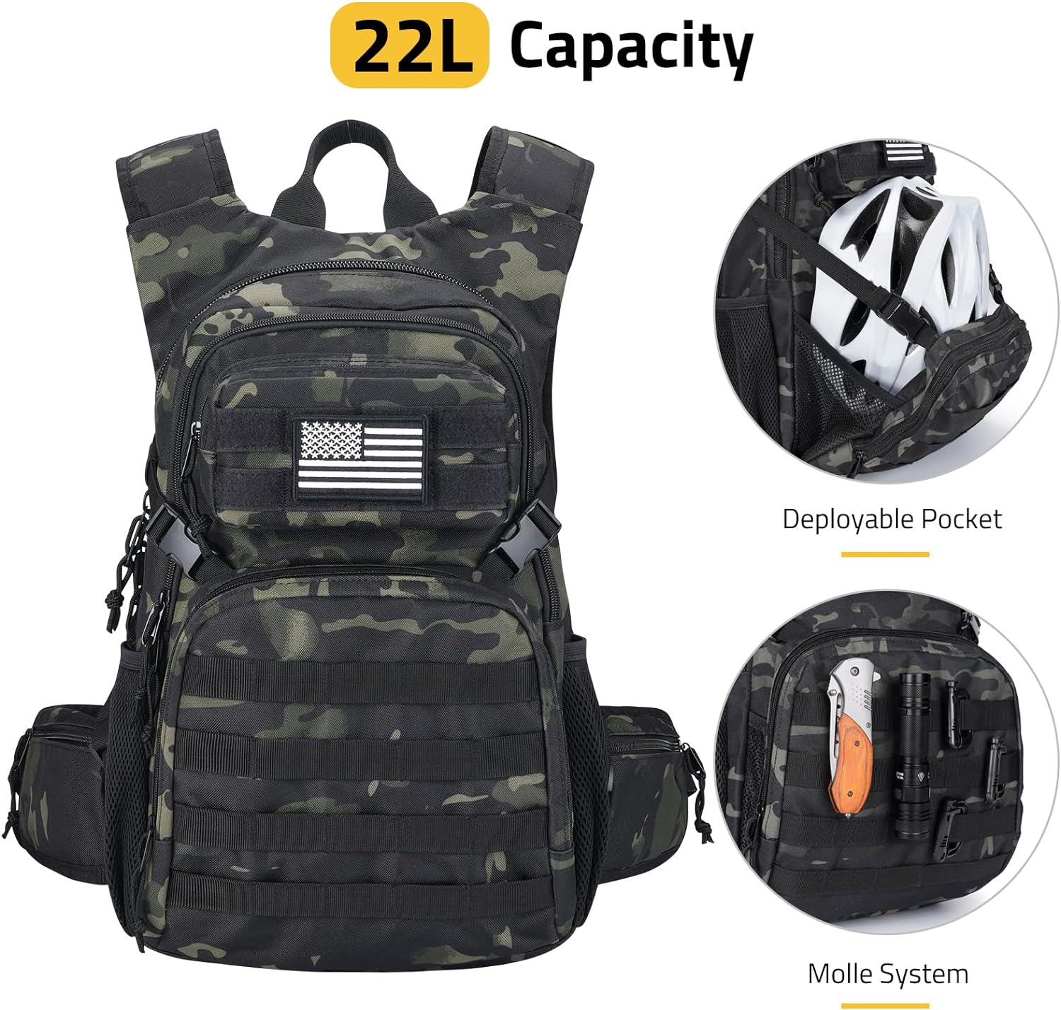 Large Capacity & High Quality: The size of our hiking backpack is 18.5 x 10.5 x 7 inches and has a large capacity of 22L. The sandwich between the outer pocket and the middle pocket of the water backpack provides larger additional capacity, providing you with ample space to store essentials. The tactical hydration pack backpack is made of 900D x 600D PVC high-quality material with excellent tear and wear resistance to meet the needs of outdoor adventures.