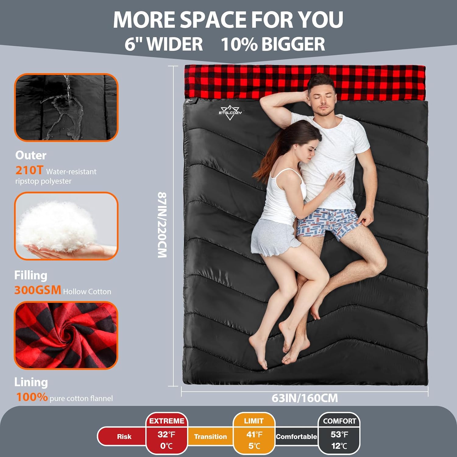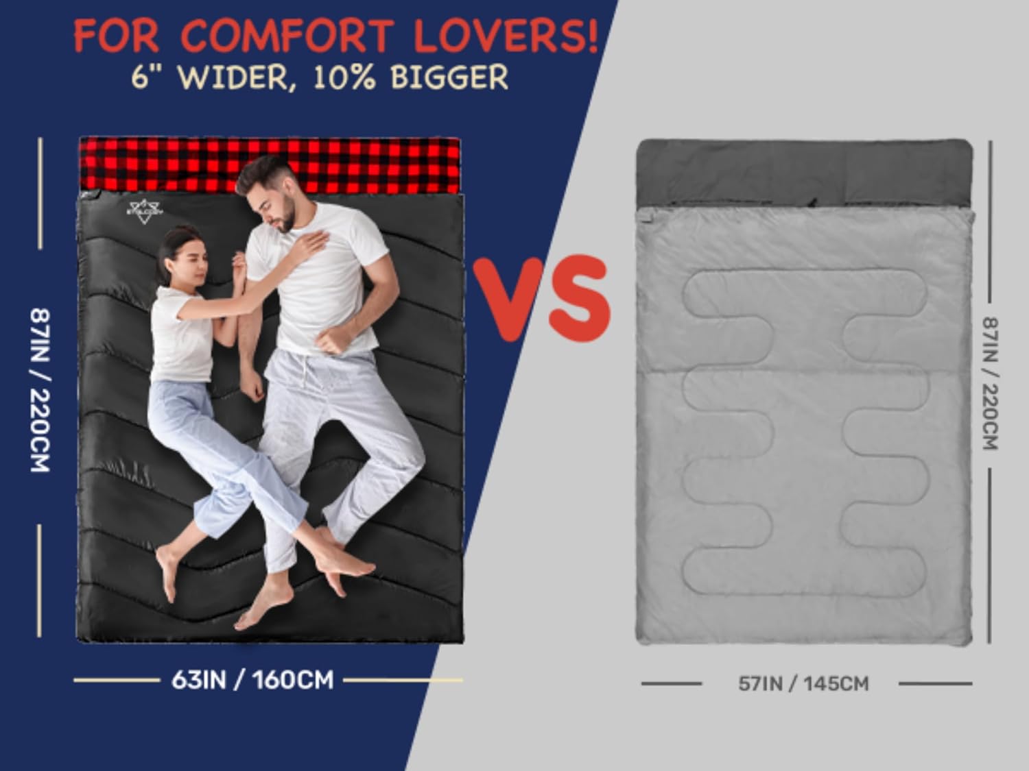 FOR COMFORT LOVERS! Ours are 6in wider than most double sleeping bags. The perfect camping sleeping bag for those who prioritize comfort and a generous size over portability and weight. While we’re in here, you can get a wider double sleeping bag, COZY and Enjoying The Good Life.