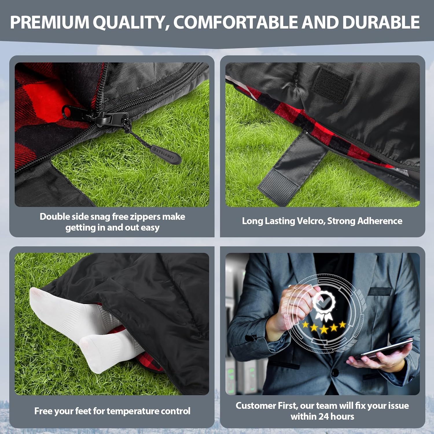 SUPER WARM & MORE SKIN FRIENDLY! The outer shell is made of super strong waterproof and camping grade polyester fabric, super-soft 100% cotton flannel lined and 300GMS 3D inner synthetic fiber fill for optimal warmth. No need to suffer with a cheap, cold, tight sleeping bag! Large enough to comfortably snuggle up with first time campers in the great outdoors.