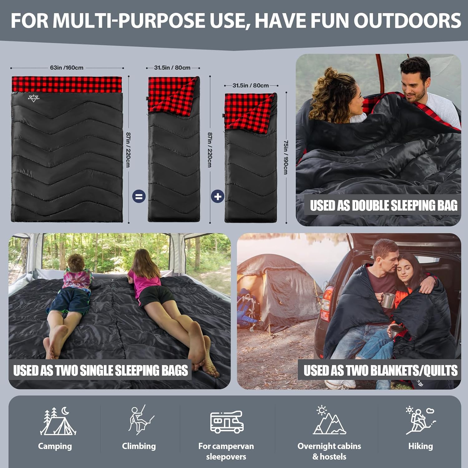 LARGE DOUBLE SLEEPING BAGS FOR ADULTS AND KIDS! FAMILY CAMPING FAVORITE! This Queen Size Sleeping Bag with a width of 63” is large enough for two people providing a roomy experience for couples and even families with small children. Or as 2 individual sleeping bags, or two queen sized blankets. Perfect for hiking, camping, traveling, Essential for Car Camping!