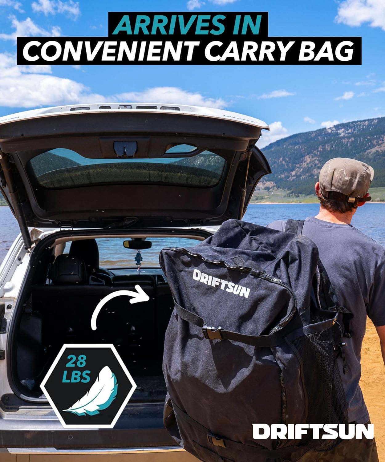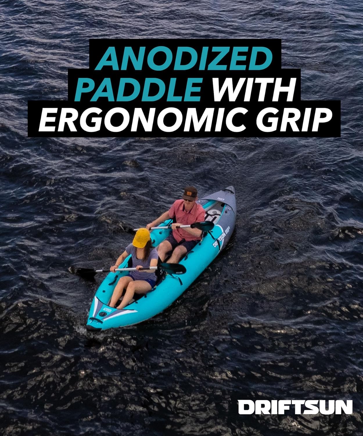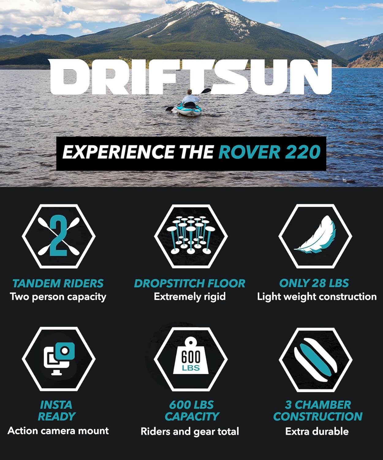 2 PERSON KAYAK: The Driftsun Rover 220 tandem kayak features a front & rear rocker profile, so you can maneuver & navigate through calm or rough water with less tracking. The foldable kayak inflates fully in 6 mins & seats 2 adults (600lbs max)